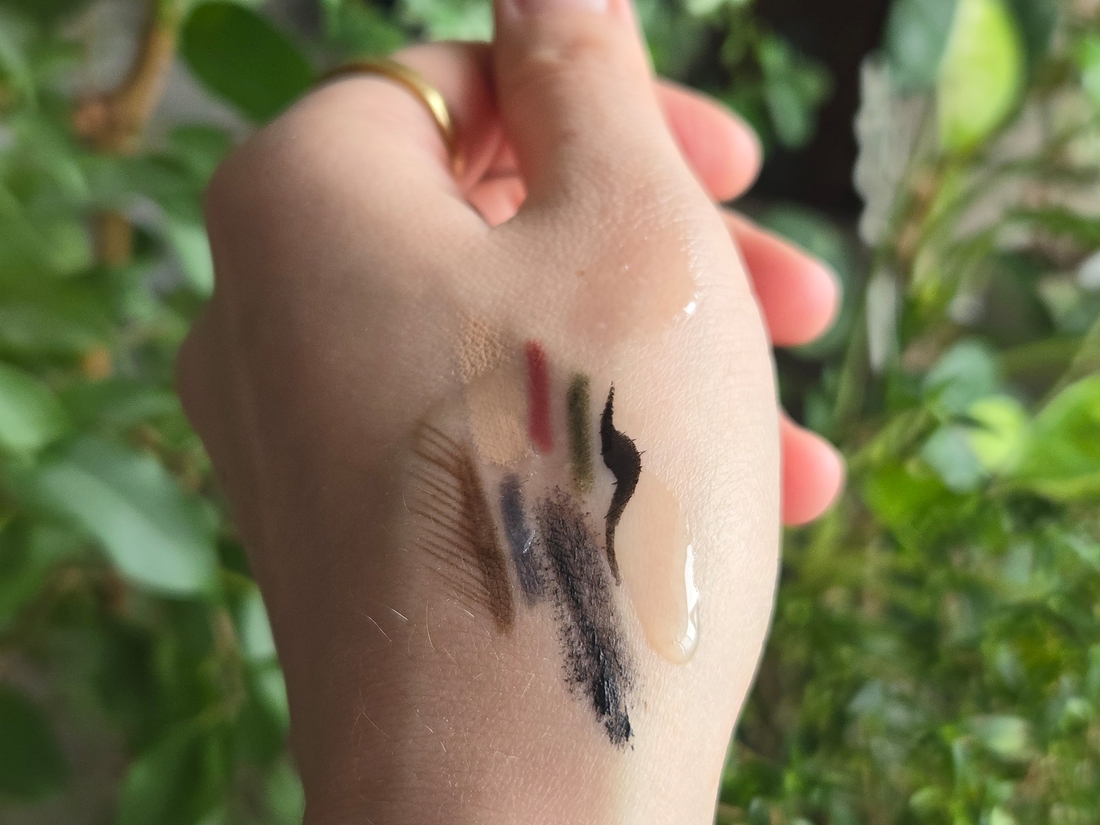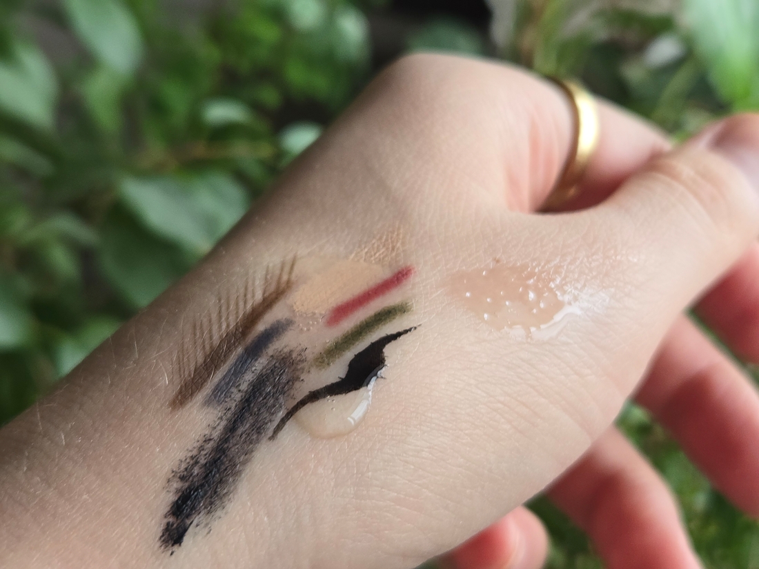 Рассмотрим теперь его главную функцию это удаление макияжа. На руку я нанесла различные карандаши для век, губ и бровей, консилер, чёрную тушь и гелевую подводку.