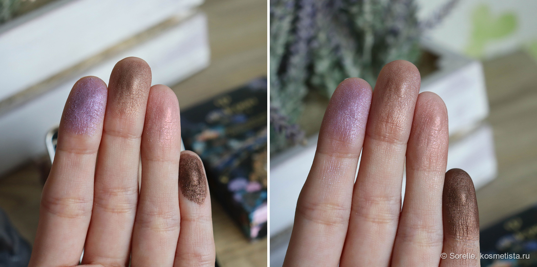 Холодный сиреневый для меня — звезда палетки. Он деликатный, но при этом красиво искрит голубыми и розовыми блестками. Я вообще люблю подобные оттенки, так что этот полюбила заочно)