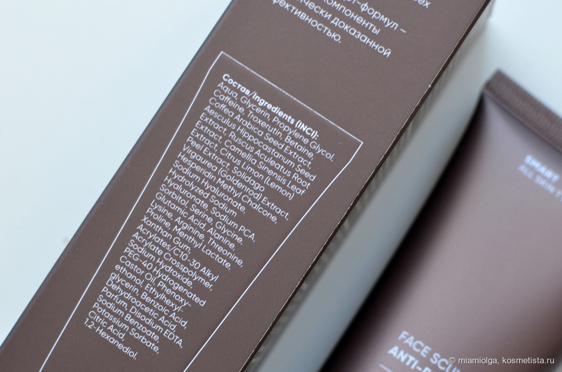За улучшение лимфотокав составе мы видим кофеин, троксерутин и дренажные пептиды. Также имеется конский каштан — «золотой стандарт» для хорошего лимфотока. Заявлено 7% дренажного комплекса (это немало, даже для смываемого средства). За увлажнение отвечают две формы гиалуроновой кислоты и NMF.