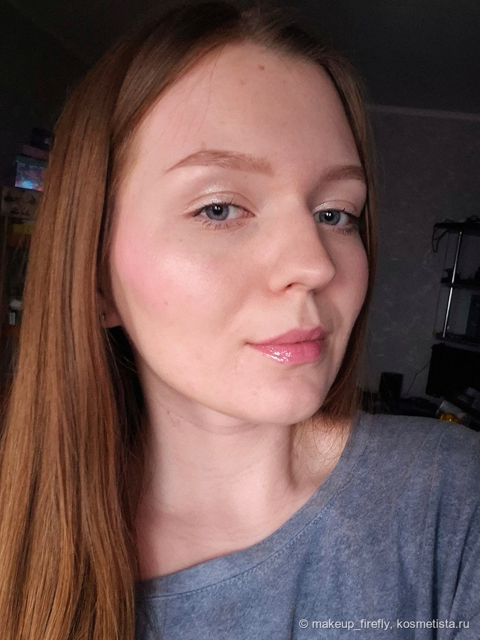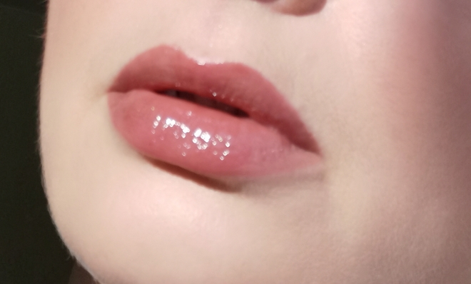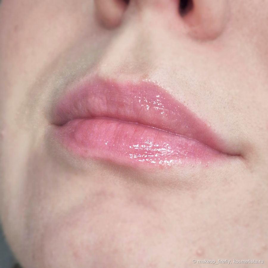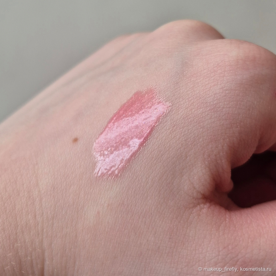 На руке блеск выглядит чуть более персиковым, чем в упаковке, но на губах все как надо.