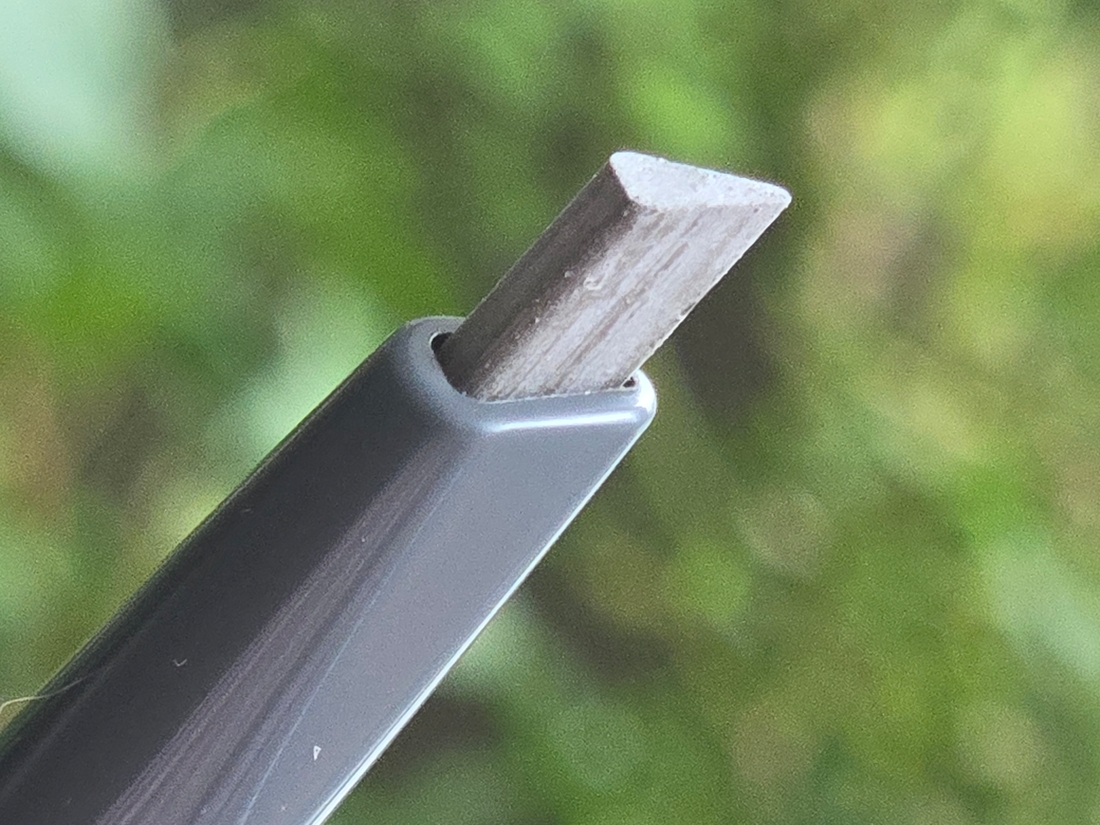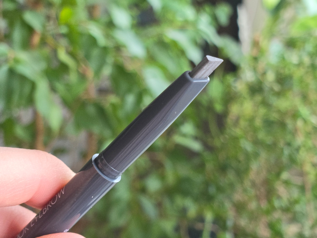 Сам карандаш в сечении является треугольником, есть острая часть для тонкой прорисовки волосков, а есть толстенькая, ей удобно закрашивать основную массу брови.
