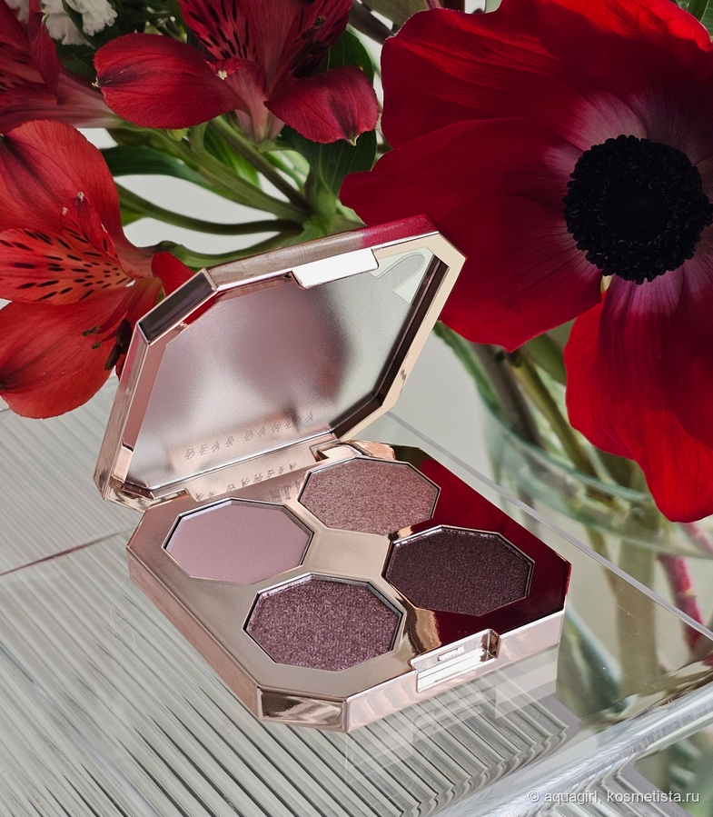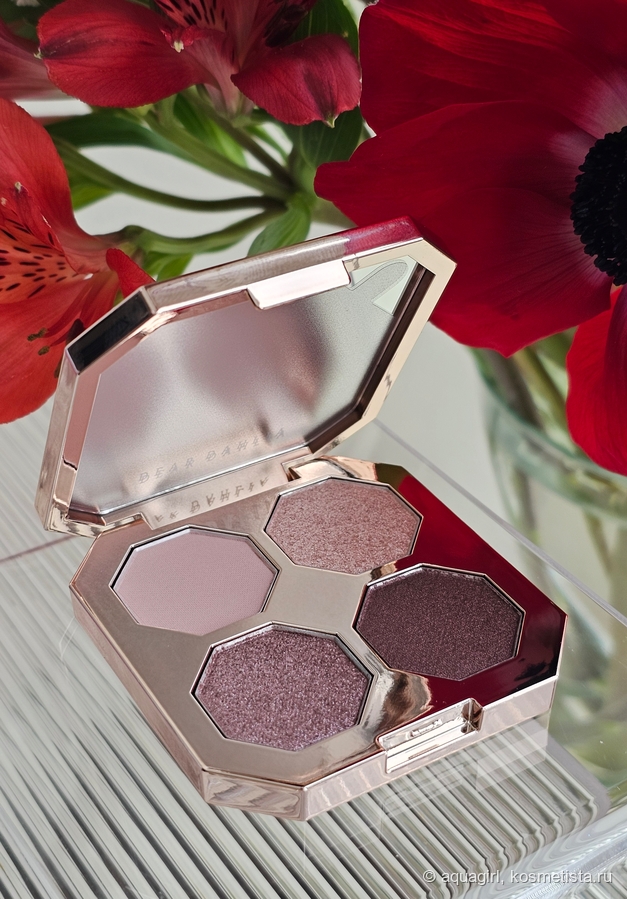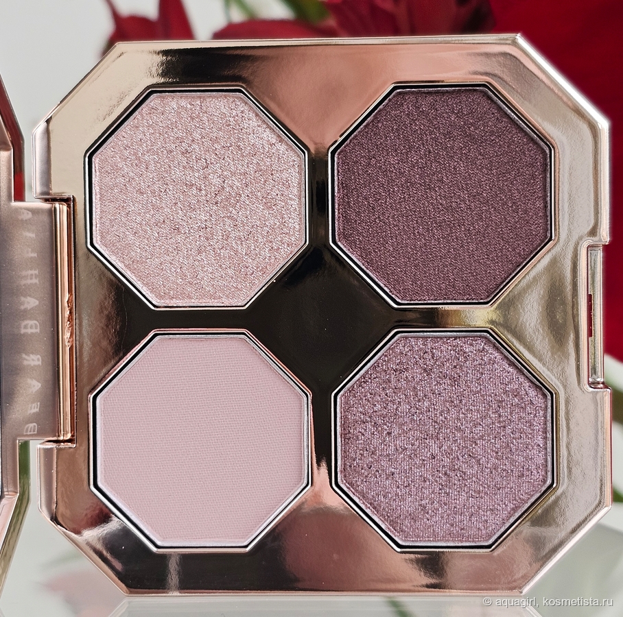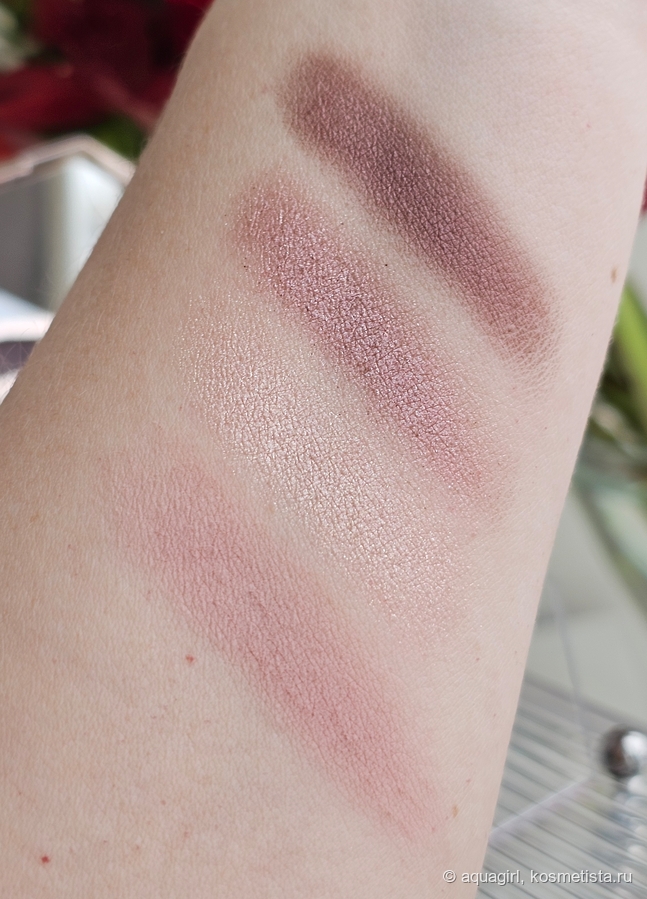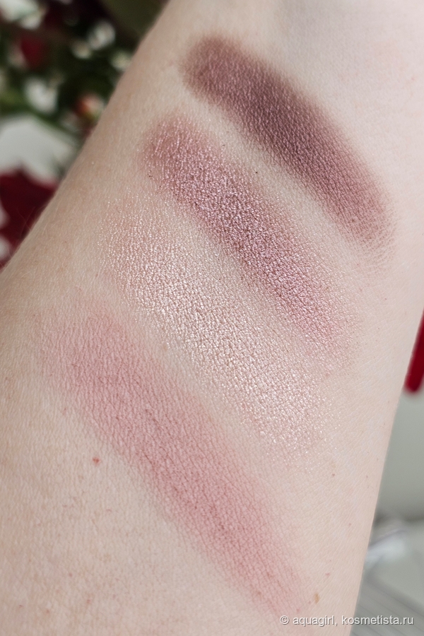 Гамма палетки больше холодная, розовато-лиловая. В описании почему-то заявлено 2 матовых и два сияющих оттенка, хотя, очевидно, что матовый оттенок только один, ещё один сатиновый и два сияющих.