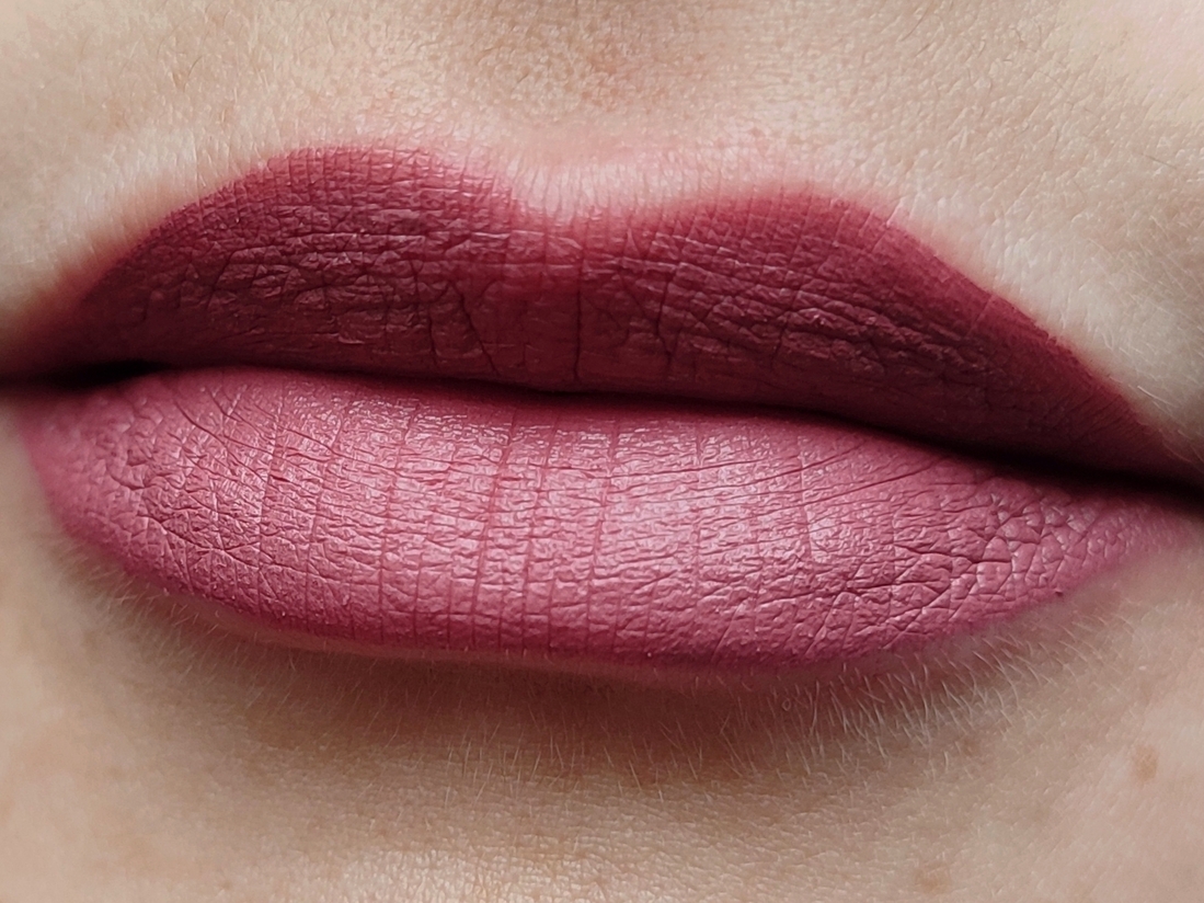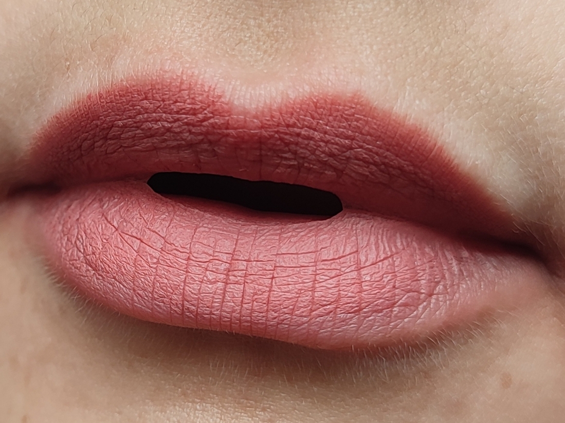 При нанесении спонжем — лиловый розовый. Как и все оттенки, равномерно распределяется по губам.
