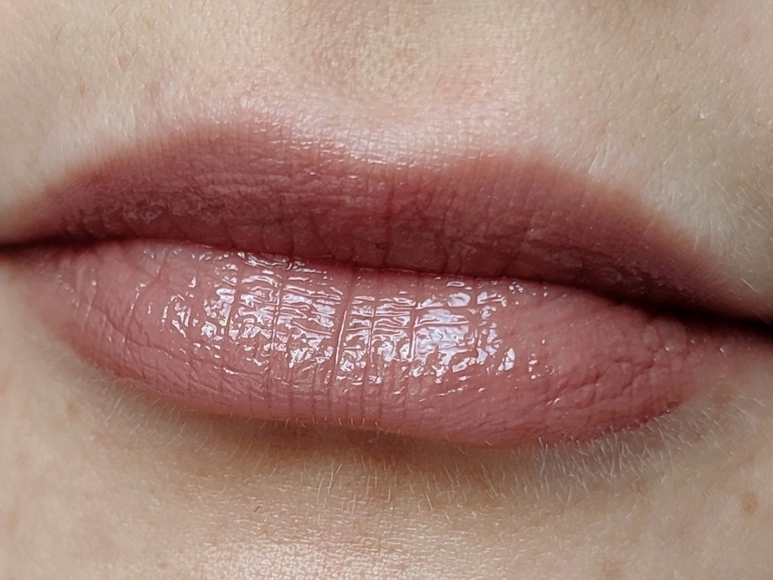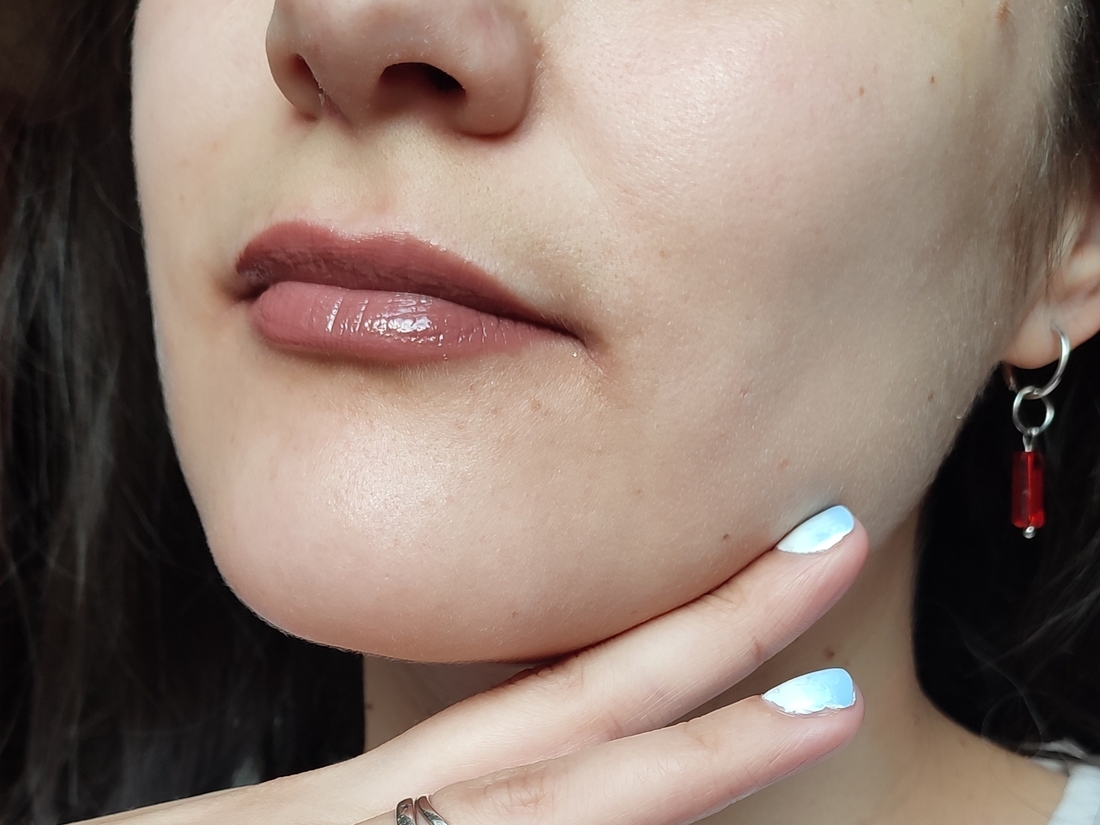 А теперь вернёмся к спонжу и посмотрим блеск на губах. Количества, которое он выдает, хватает покрыть губы тонким слоем. Оттенок полностью перекрывает пигмент моих губ, хоть и смотрится полупрозрачно.