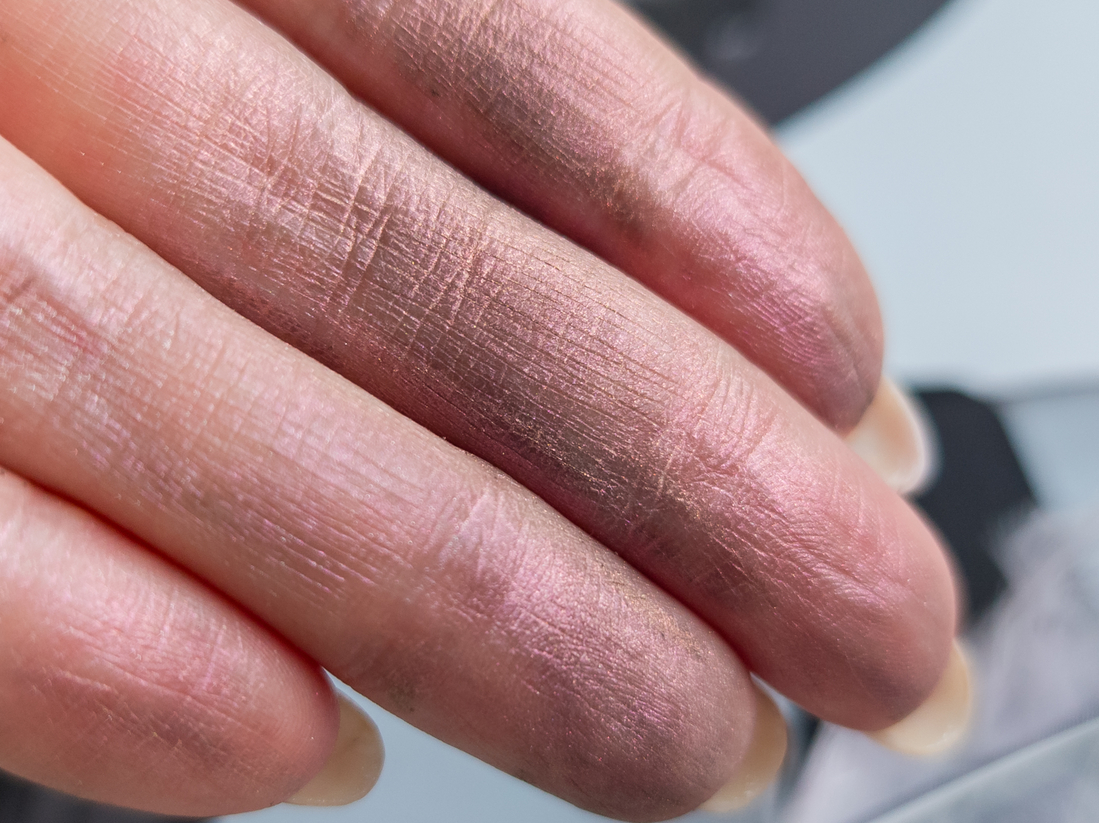 Весьма необычный оттенок, серо-графитовая база с пепельно-фиолетовым переливом, но увы на свотче он не так эффектен, как в макияже. На глазах же как будто использовано минимум два оттенка, но самом деле только лишь один пигмент.