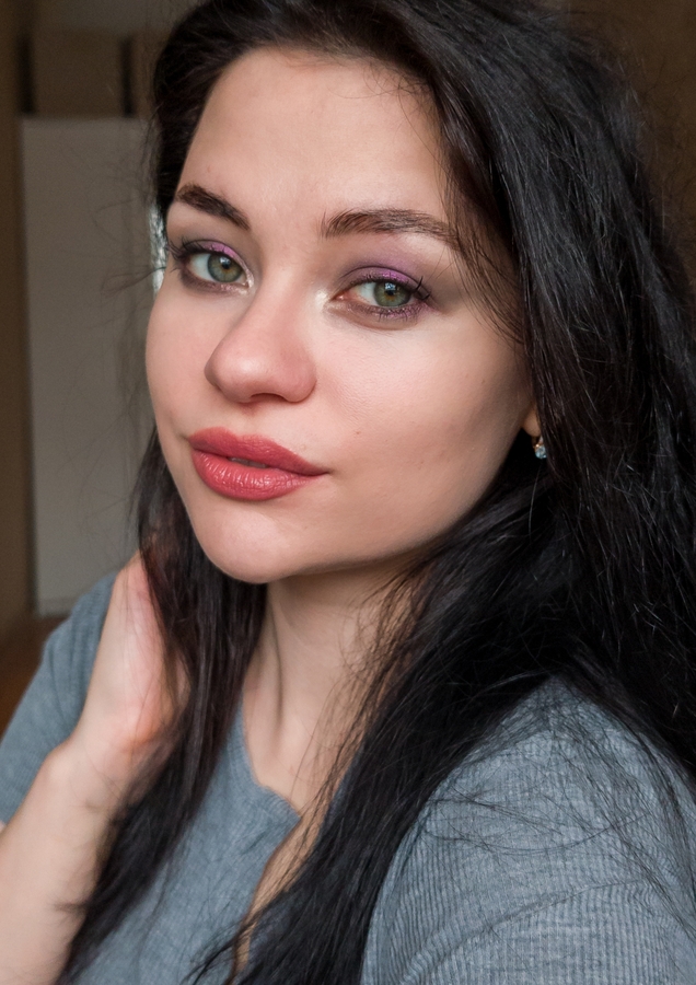 Подружится с ним очень легко, формула такая же тонкая, границы легко тушуются пушистой кистью, и несмотря на то, что оттенок сам по себе тёмный и не совсем нюдовый, на глазах он смотрится как-то вуально и невесомо. Осыпается чуть больше, чем предыдущий пигмент, поэтому тон лица советую делать после макияжа глаз.