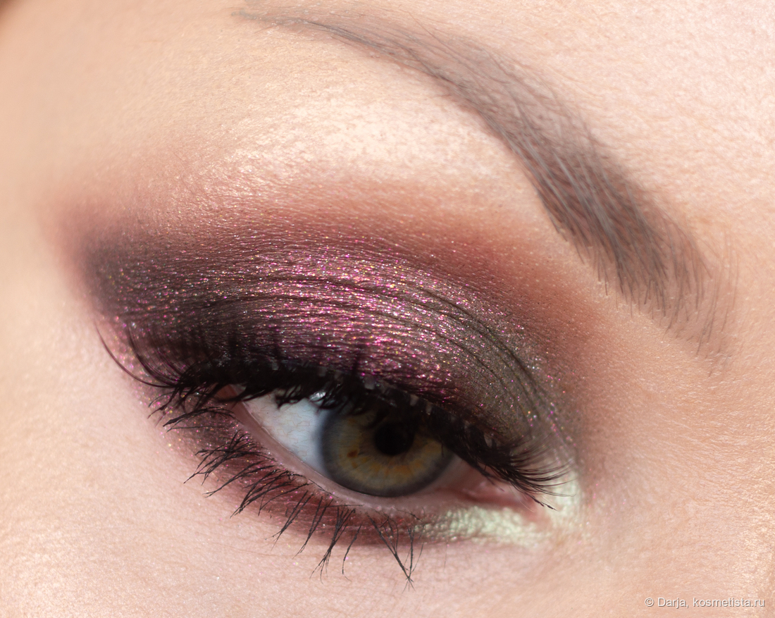 На следующем варианте макияжа закончились шиммерные частицы в чёрном оттенке, но немного увидеть их ещё можно. Добавила минимально дуохром на центр верхнего века, во внутреннем уголке тоже он.