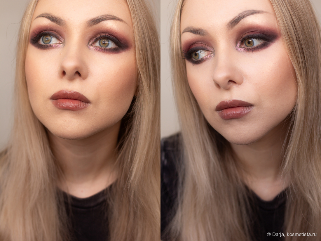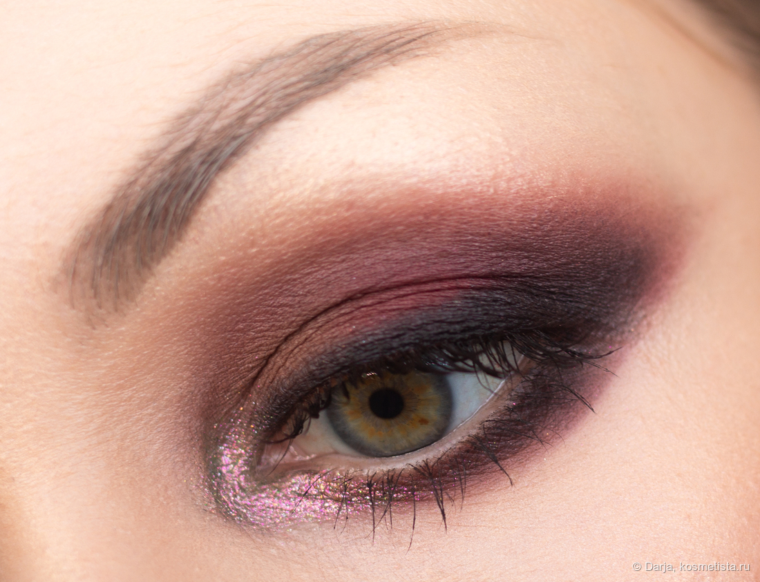 Тени прекрасно переносятся на веки, легко растушёвываются, не скатываются. Как обычно отмечу, что база у меня Urban Decay Anti-Ageing Eyeshadow Primer Potion. Единственный момент, который меня смутил, это то, что красный металлик оказался не красным металликом — красные вкрапления шиммера быстро закончились, осталась база в виде обычного чёрного оттенка: