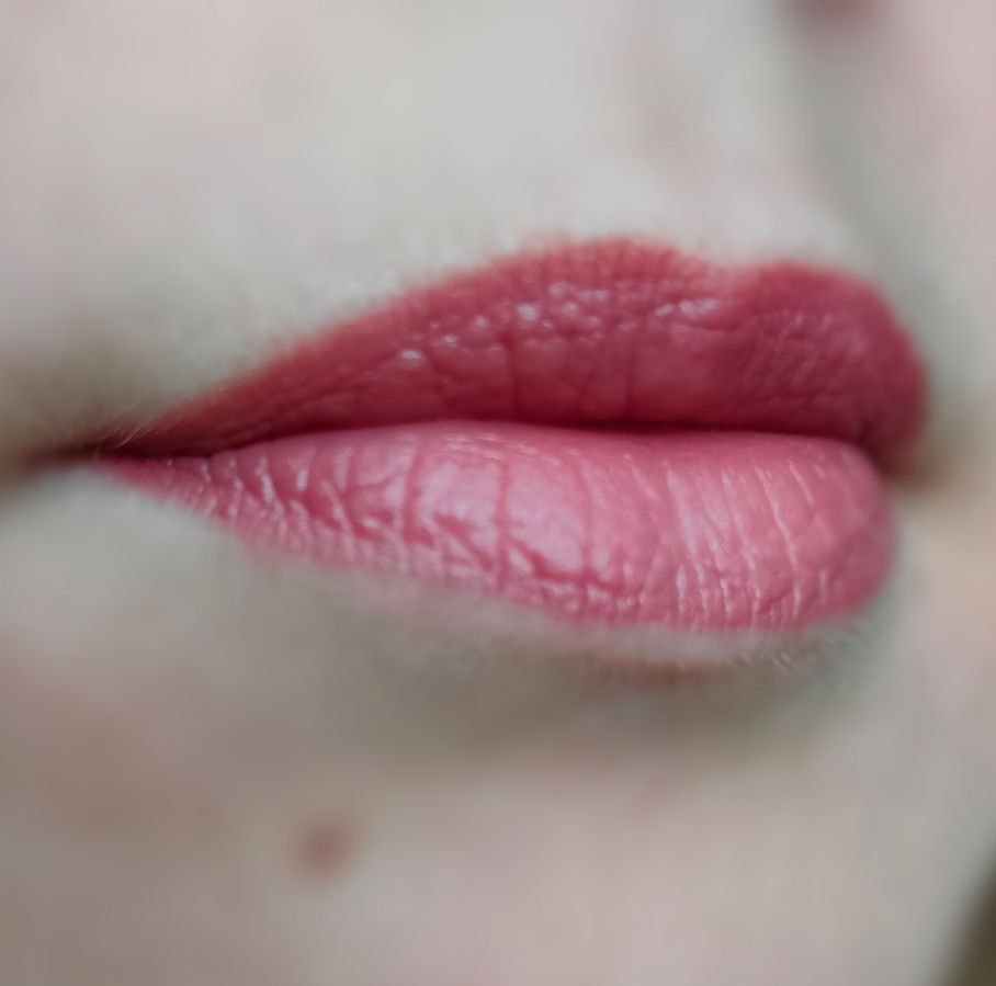 Любопытно, что он не скрадывает объем губ, не смотря на яркость. В общем виде, при искусственном свете.
