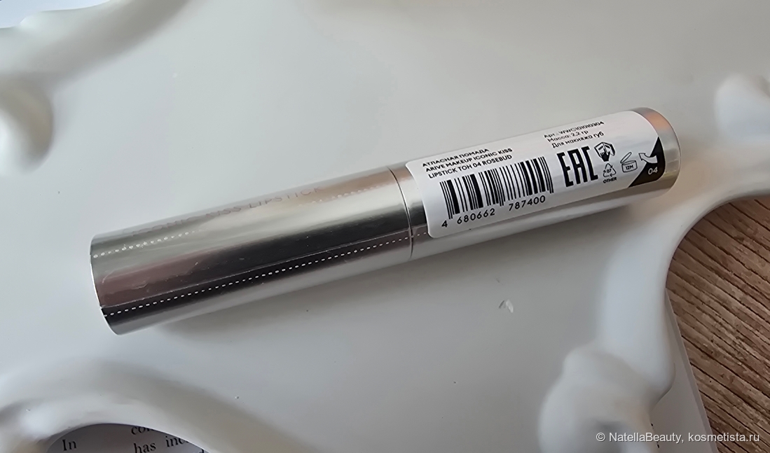 Помада-стик находится в пластиковом серебряном футляре. Дизайн компактный, стильный и лаконичный. Изначально помада была запечатана в плотную прозрачную слюду, на которой был стикер с информацией о продукте.
