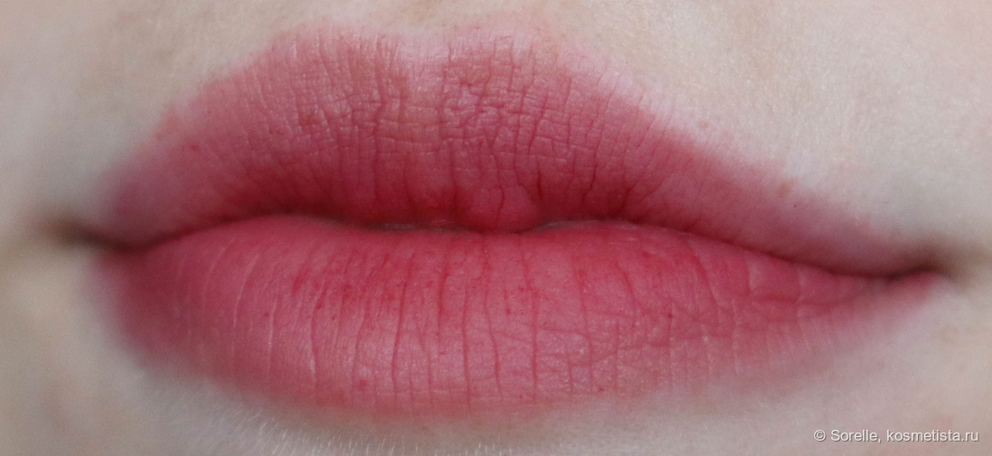 На губах я от суфле не в восторге — всё-таки оно ощущается суховато и подсушивает губы, особенно это заметно зимой. Лежит на губах при этом неплохо даже когда губы в состоянии так себе — на фото видно, что пигмент зацепился на суховатых участках и подчеркнул шелушения, но в такую погоду мне матовые продукты за это даже ругать не хочется. Вот за сухость да, летом она ощущается меньше, но все же есть.
