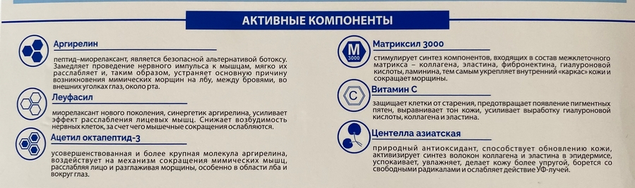 - Пептидный комплекс — главный герой в составе. Мощные пептиды работают с мимическими морщинами: помогают расслабить заломы и стимулируют выработку коллагена.