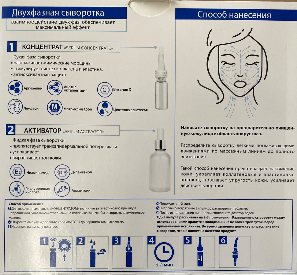 Несмотря на название сыворотка, это целый набор. Продаётся в он в картонной коробке, на которой очень подробная информация о составе, ключевых ингредиентах спобобе использования и пр.