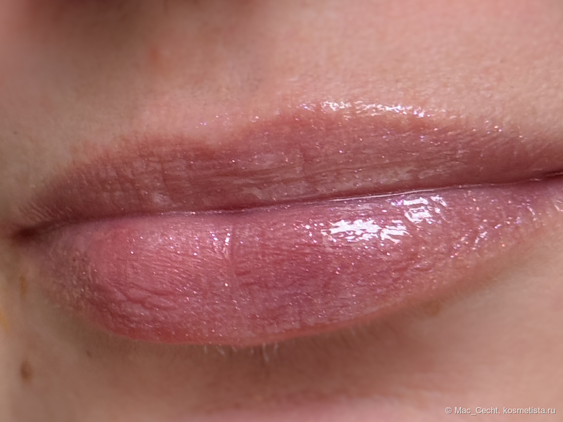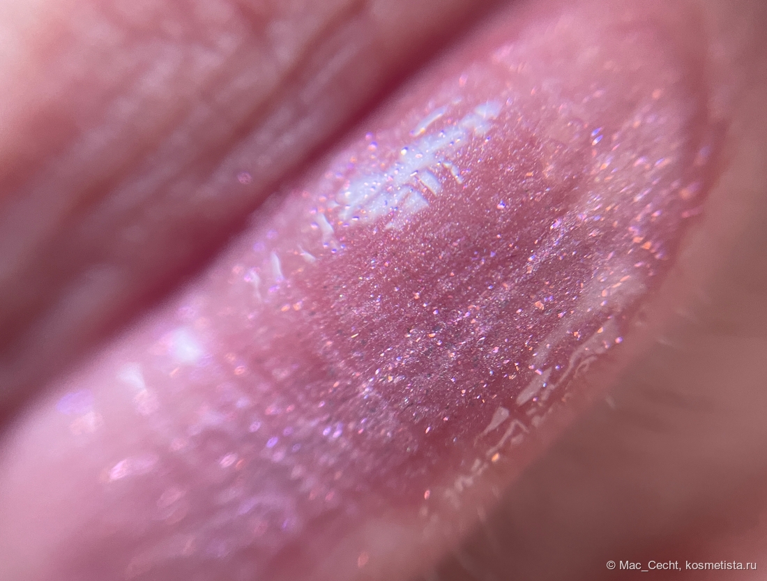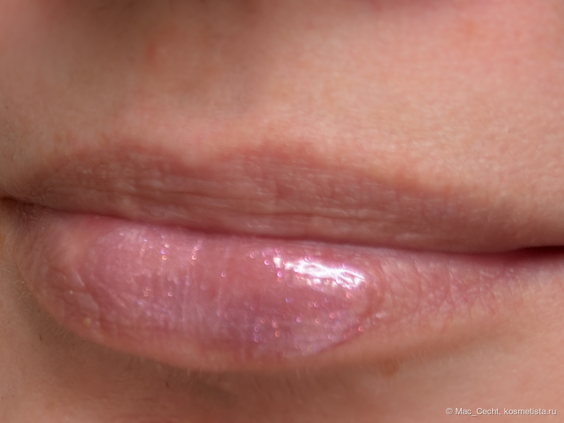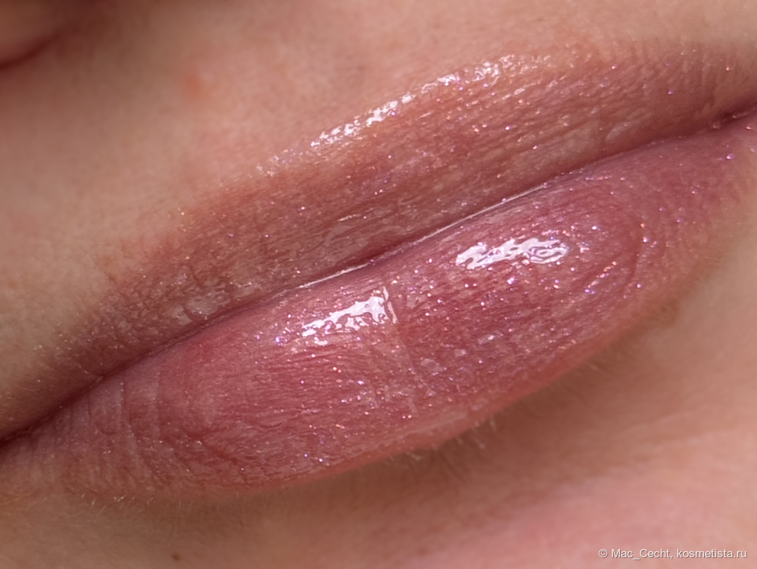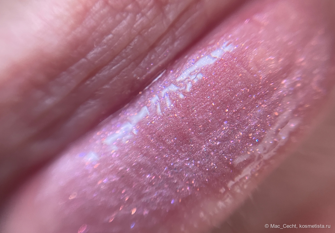 Блеск не липкий, очень гладкий. Смотрится красиво, даже тонким слоем — у блеска хороший глянец, и эти шиммерные частицы придают какой-то неземной эффект.