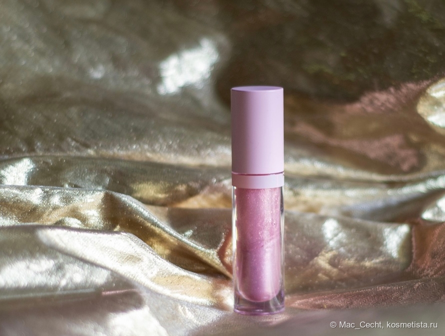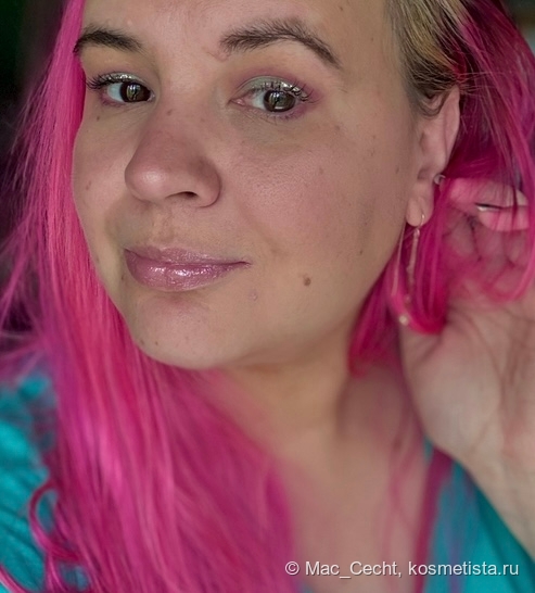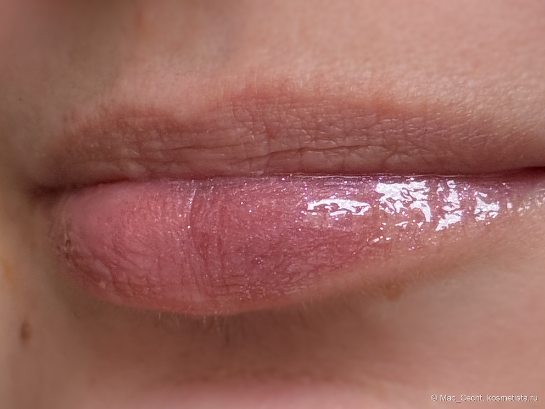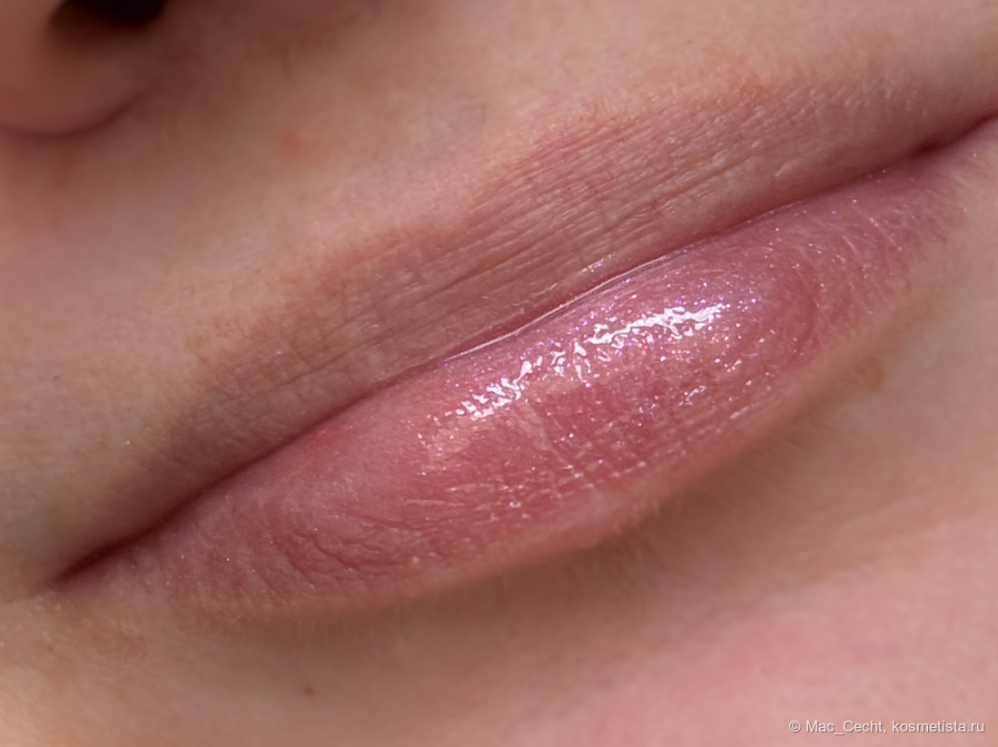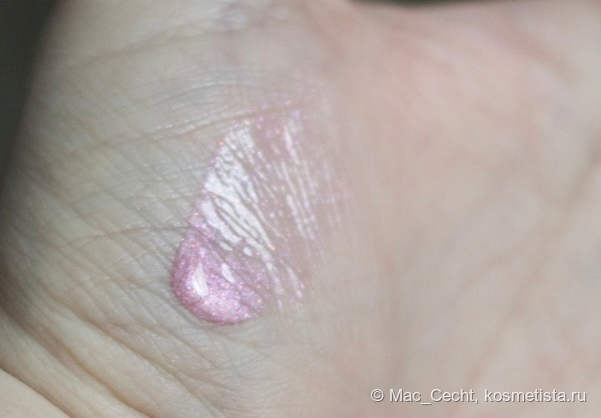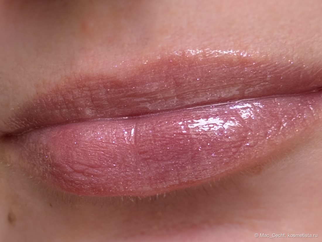 Блеск не липкий, очень гладкий. Смотрится красиво, даже тонким слоем — у блеска хороший глянец, и эти шиммерные частицы придают какой-то неземной эффект.