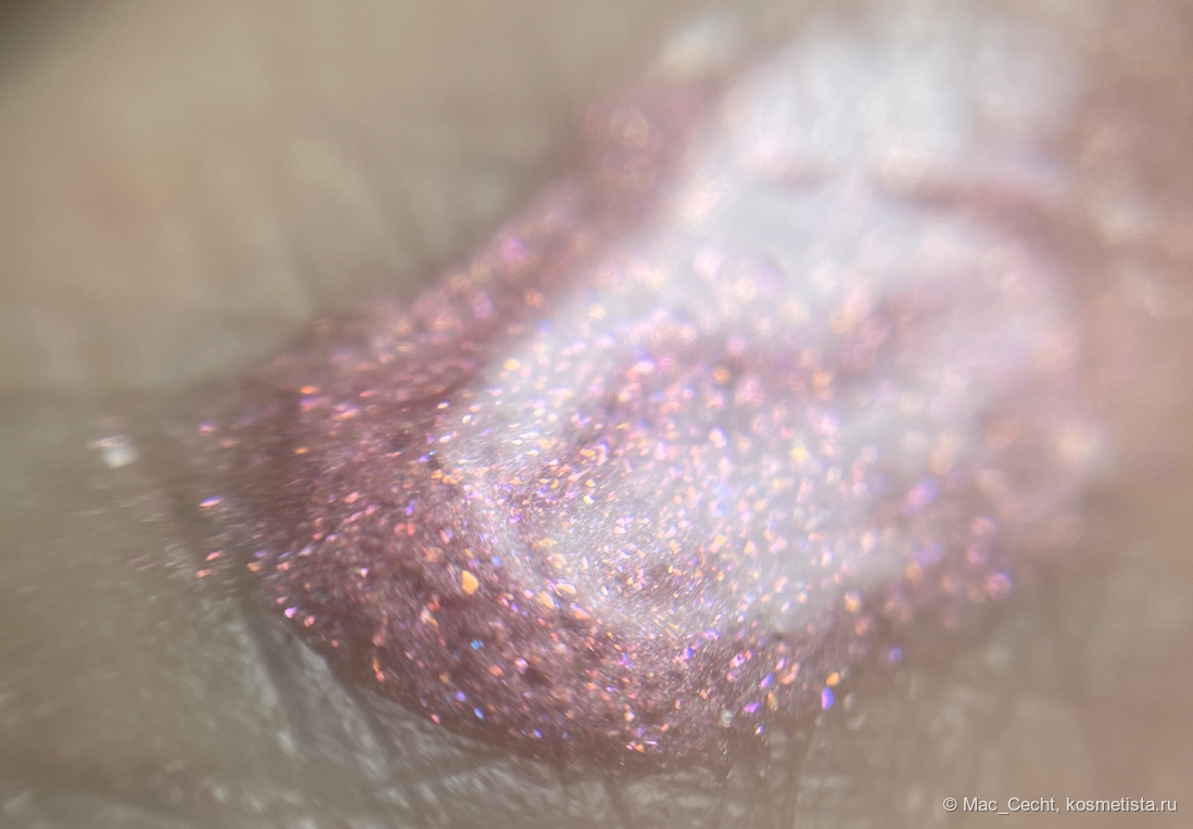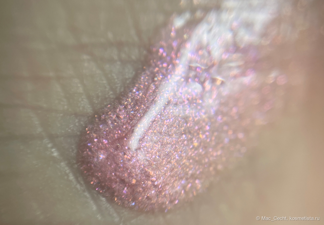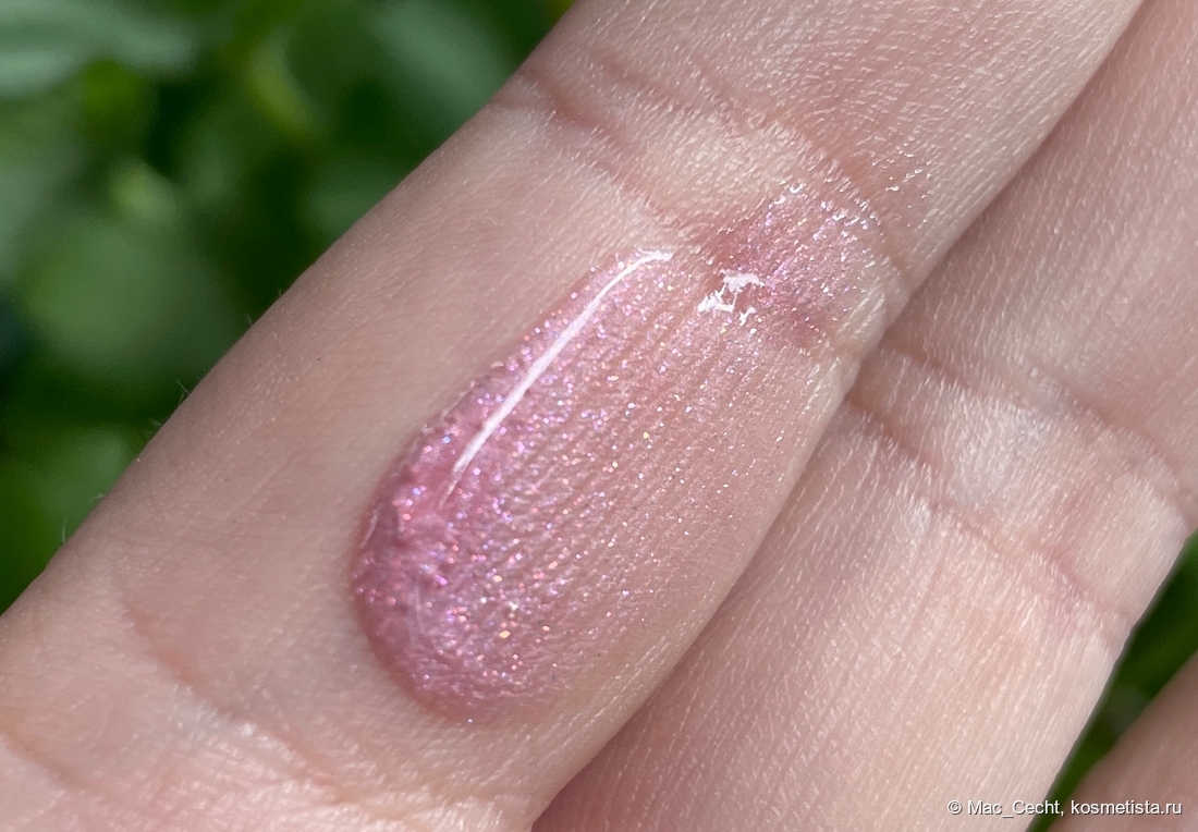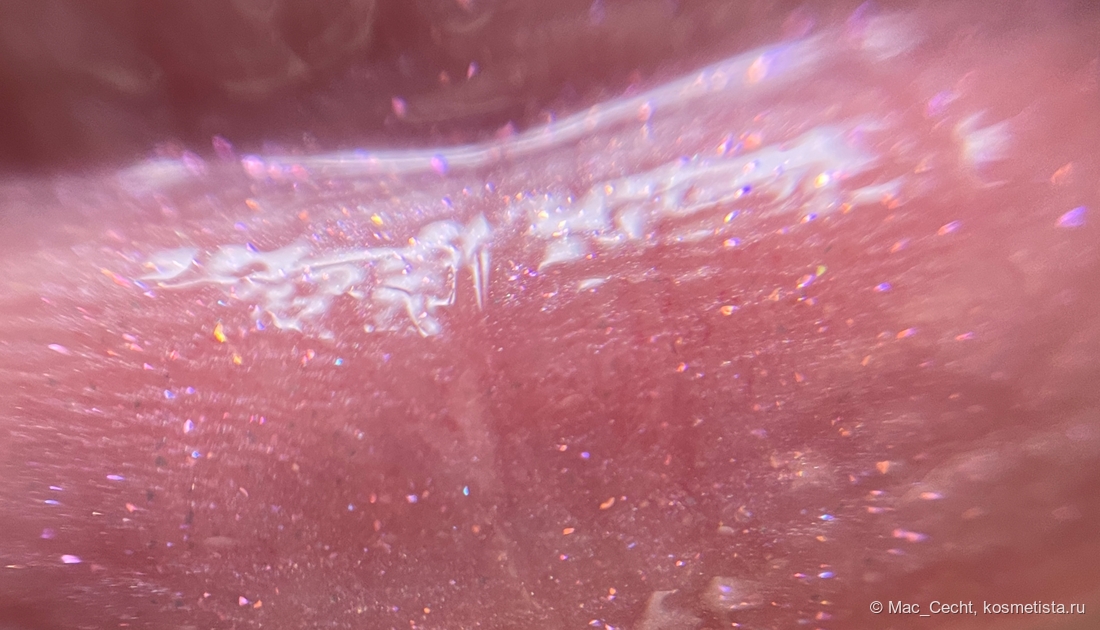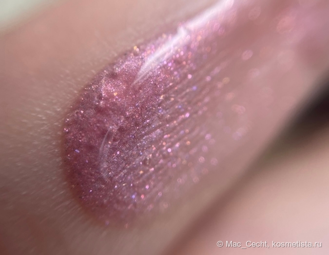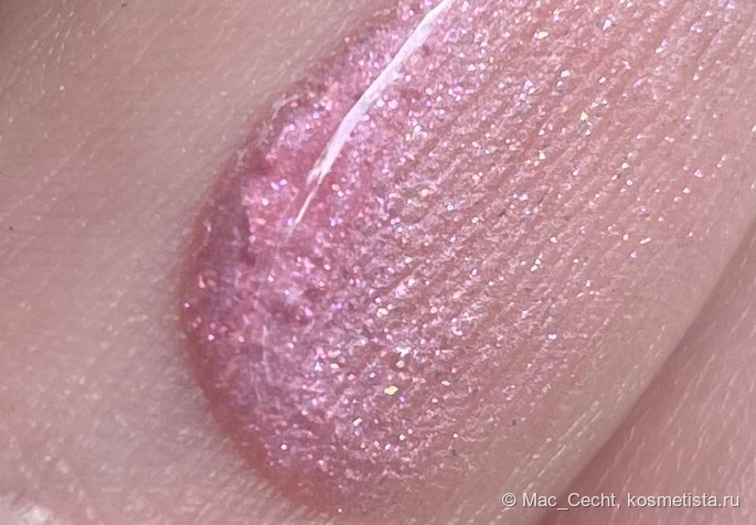 На мой взгляд, там есть как шиммер, так и мельчайшая молотая слюдабледно-розового и светло-золотистого цвета. Но это не мерцающий блеск, он не будет искриться и переливаться, он может казаться или нюдом с изюмом, или, при наслаивании, что-то типа металлика под слоем прозрачного блеска. Камера показывает больше отдельных блесток, в реальности поверхность выглядит более гладкой.