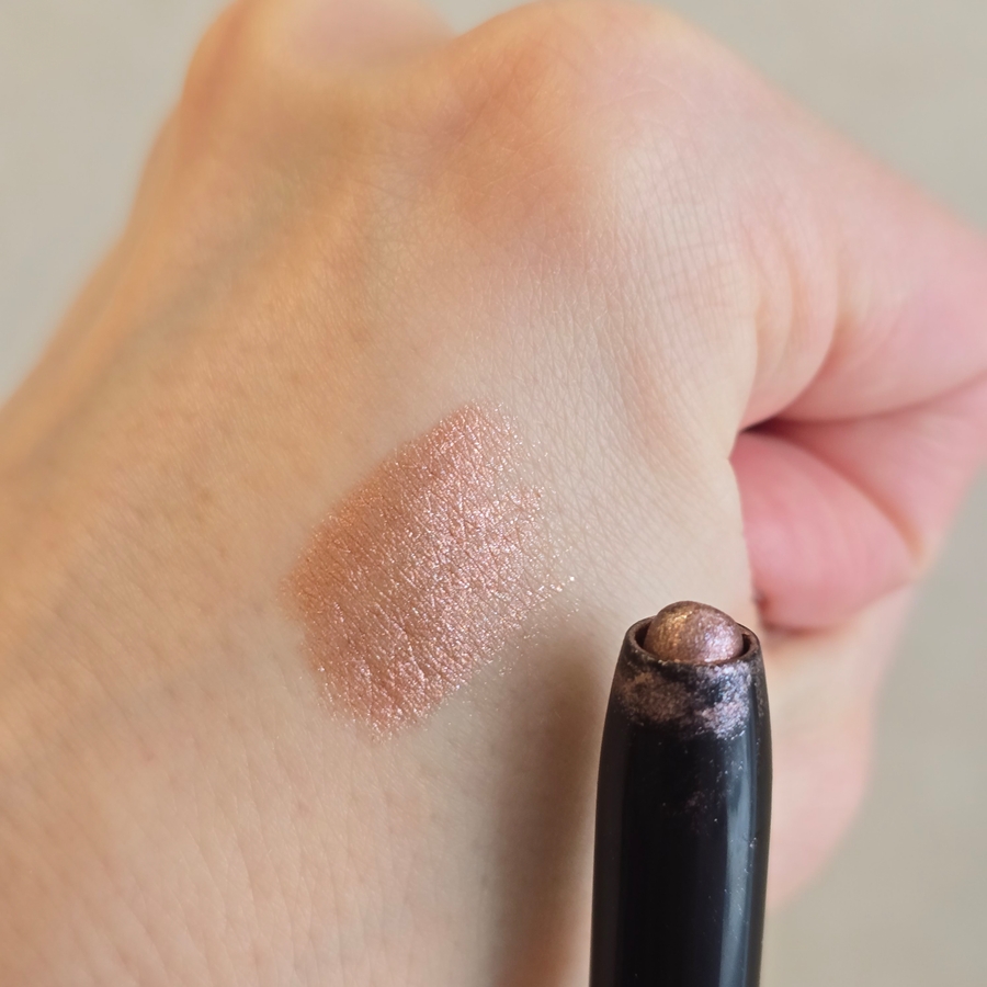 У меня тени в оттенке 04 «Розовое золото». Стик имеет выдвижной механизм, как у автоматических карандашей. Выглядят лаконично и просто. Довольно быстро после начала использования на пластиковом корпусе появились трещинки, что странно, учитывая, что я его не роняла и никуда не ношу с собой. Качество упаковки оставляет желать лучшего. Сам же стик обладает кремовой текстурой, легко скользит по веку и хорошо растушёвывается хоть пальцем, хоть кистью. Растушёвку нужно выполнять достаточно быстро, так как тени фиксируются почти мгновенно. Хорош в качестве основы под сухие тени. 04 — это тёплый розово-золотой цвет с серебристым мелким шиммером. При плотном нанесении на мне проявляется розовая металлическая основа. Стойкость отличная, до демакияжа остается со мной.