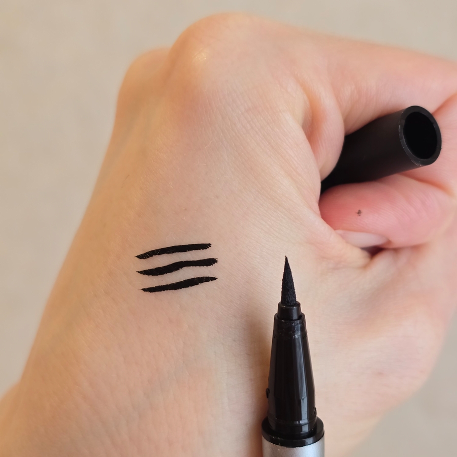 Не самая однозначная бюджетная подводка с не самым удобным фетровым аппликатором. Пигментация отличная, цвет яркий даже без наслаивания, на кожу переносится в одно касание. Стойкость радует, ничего не расплывется и не растекается. Но фетровый кончик мягкий и свободно «гуляет», поэтому, если цель очень тонкая точная линия, то здесь он экзамен завалит. В остальных случаях — справится.