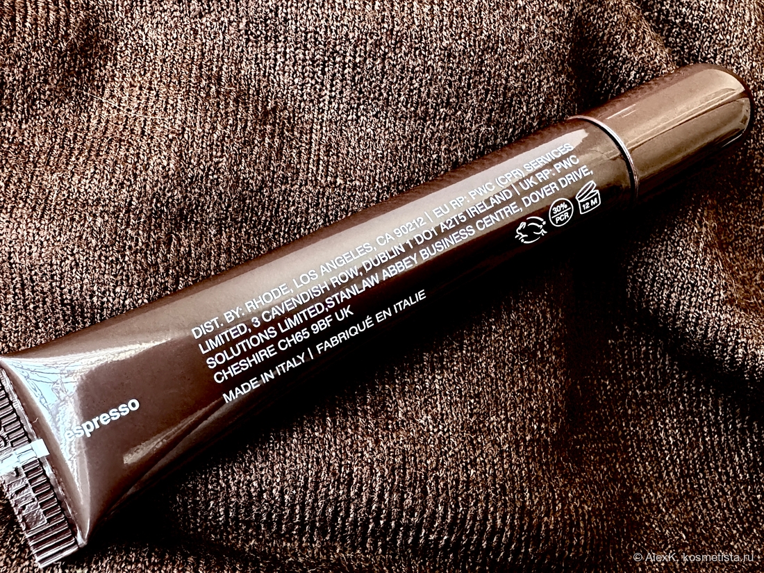 Упаковка. Rhode Peptide Lip Tint Espresso приехал в картонной коробке в тон оттенка. Внутри — пластиковая туба шоколадного цвета с откручивающейся крышкой. Дозатор — скошенный пластиковый носик с небольшим отверстием. Мой любимый вариант: максимально гигиенично.