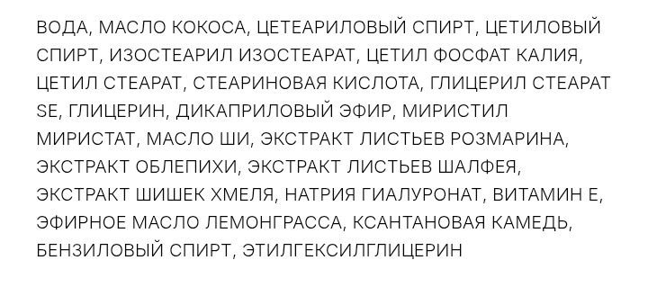 По составу он оказался практически идентичным с «Печеньковым» кремом. Только вместо отдушки здесь эфирное масло лемонграсса.