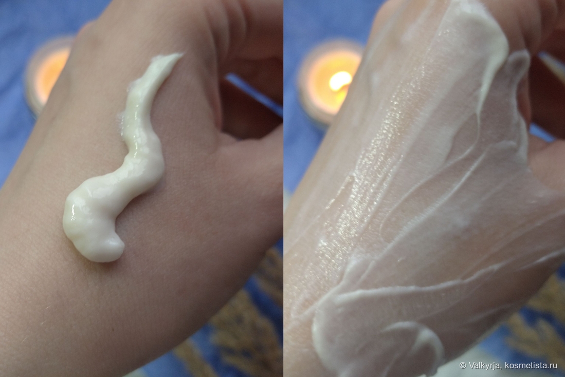 По текстуре в меру плотный, жирненький. Но быстро впитывается (за пару минут), и ещё минуты через 1,5-2 на коже не остаётся ни липкости, ни жирности, ни ощущения плёнки.