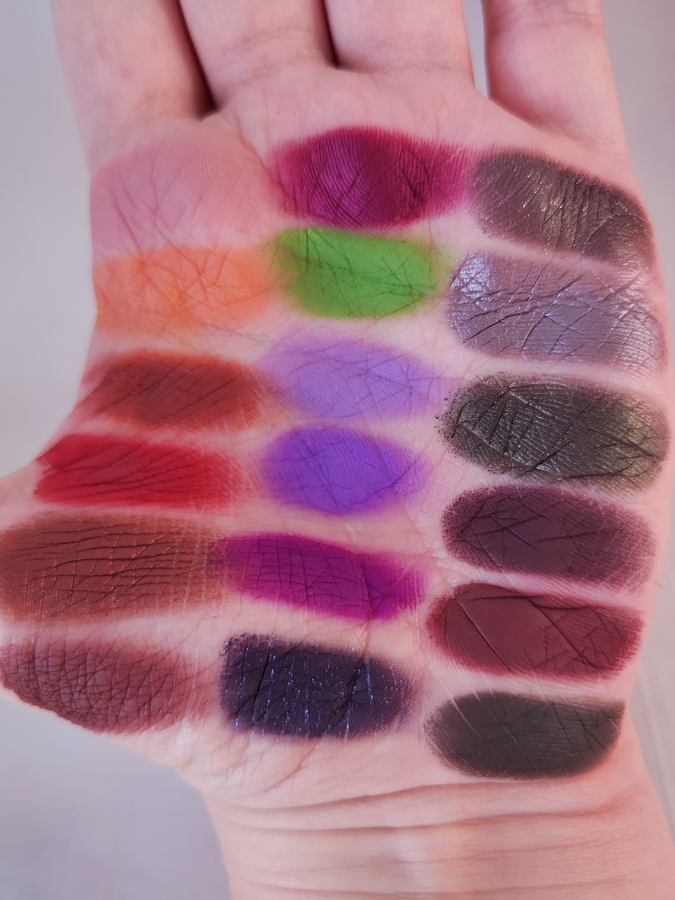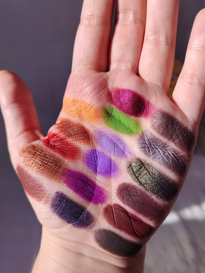 Ещё оттенки очень пигментированные, с ними нужно приноровиться работать. Новичок вряд ли справится. Также они осыпаются, хоть и не очень сильно, видАла я и похуже. Некоторые оттенки тускнеют. Бордовые и фиолетовые оставляют стейн на руке. Но кстати, на веках я этого, на удивление, не заметила. Ещё слышала что у многих людей на тени Джеффри аллергия.