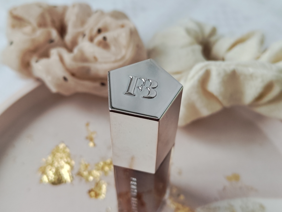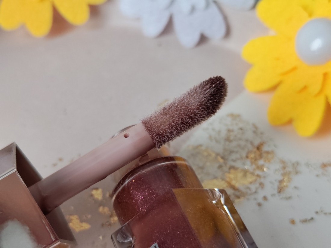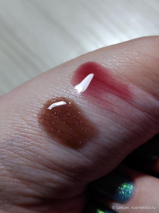 Вот так выглядит блеск на свотче в дневном свете. Коричневый оттенок, с вкраплением жёлто-оранжево-розовых блёсток. На губах они не ощущаются совершенно. Глянец прекрасный, как у всех продуктов для губ от Fenty. Пахнет сладко, конфетками. Пару раз попадал в рот, так что могу сказать что вкуса не имеет.