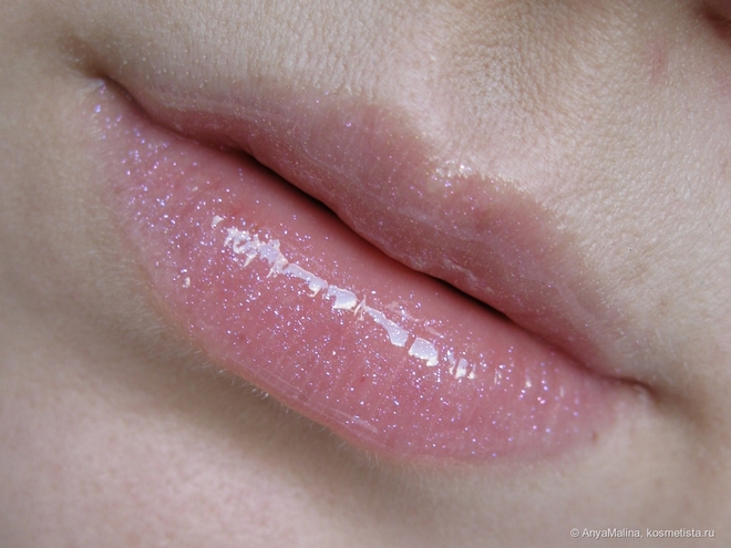 Что отрадно, блеск не только выстилает зеркальным глянцем поверхность губ, но и фактически работает как бальзам: после получаса на губах сухость проходит, а неровности становятся менее заметными.