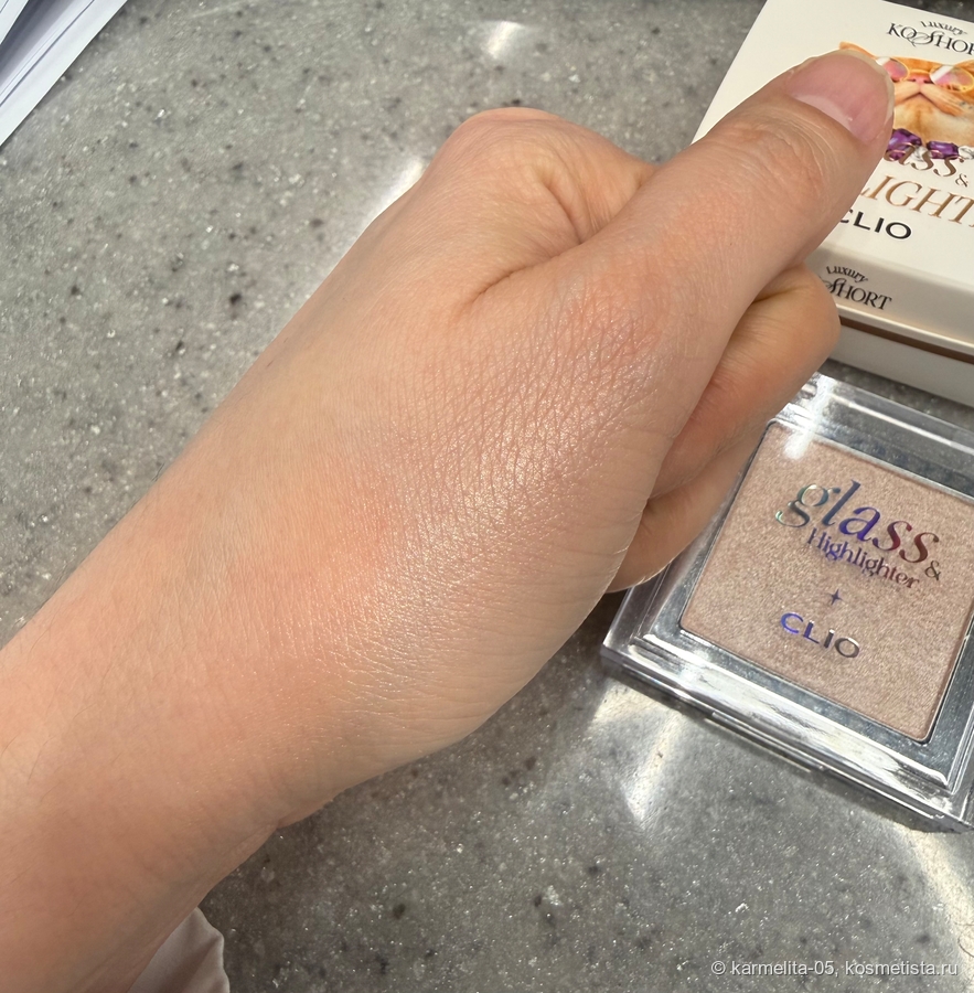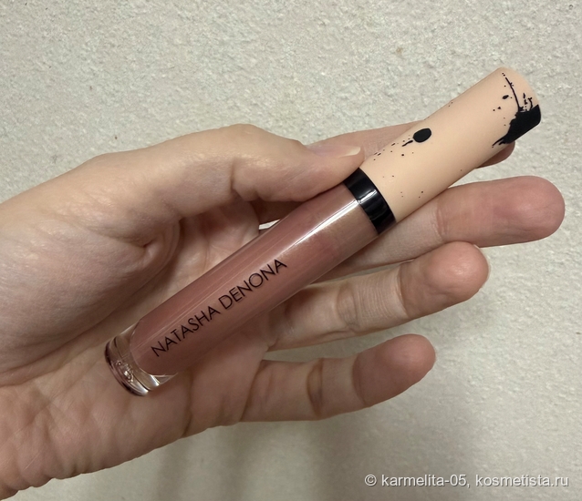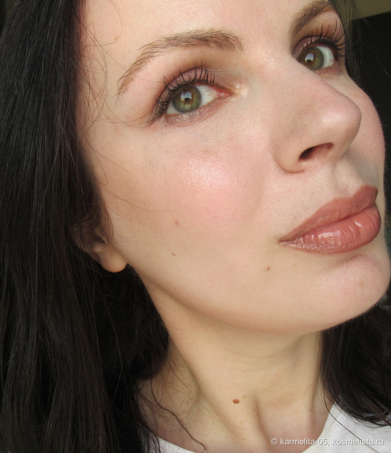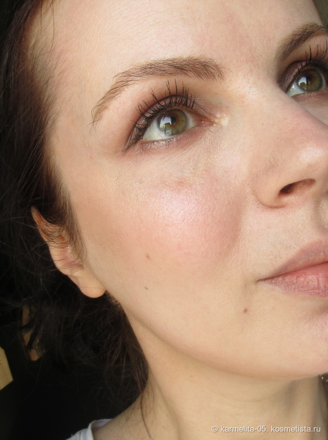 Взяла в оттенке 02 и не ошиблась — телесного оттенка без цветной базы. Наносится потрясающе любой кистью, точка нанесения становится словно стеклянная. При этом нет отдельных блесточек, ровный гладкий почти мокрый блик оттенка «нейтральный беж».