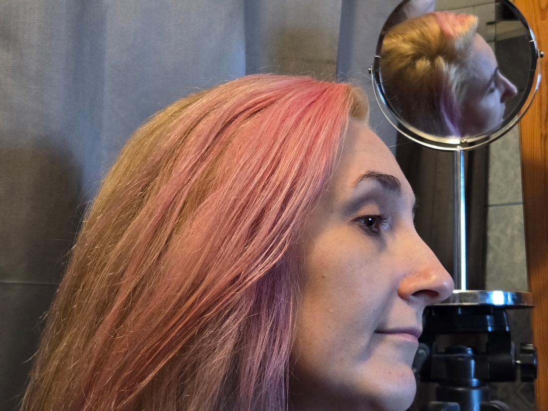 Вы видите какой барби-розовый оттенок «Коттон Кэнди Пинк» и он практически такой же, даже чуть ярче на волосах. Но цвет, к сожалению, не такой плотный, чтобы перекрыть мои неудачные эксперименты с окрашиванием спецблондом, он их подчёркивает и выводит в ржавчину.