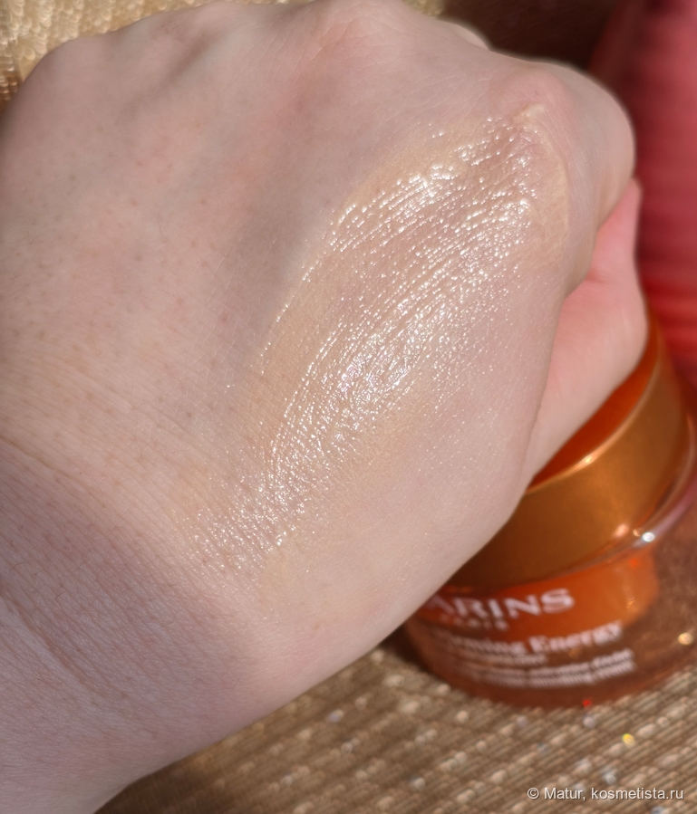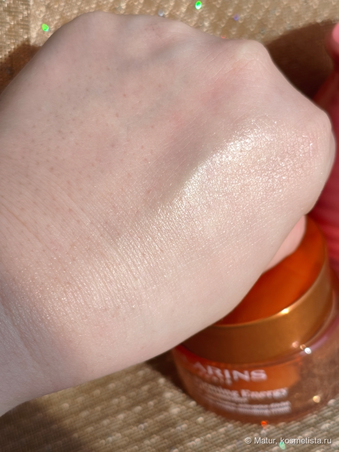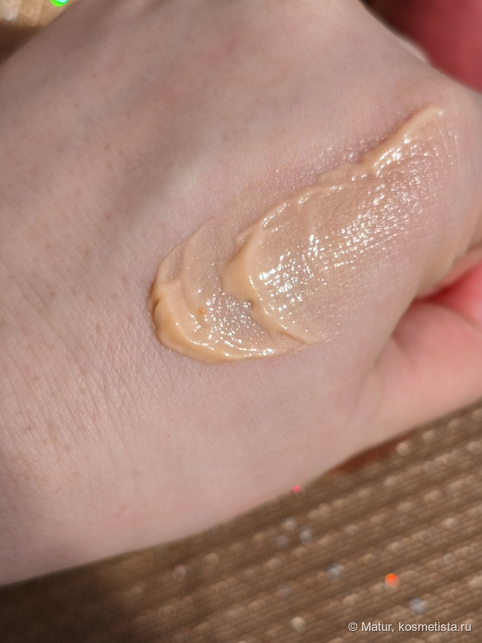 Консистенция интересная, пружинящая, когда пальцем нажимаешь в толщу, она как желе пружинит. Крем плотный, но не жирный. В составе есть шиммер, который тактильно никак не ощущается, но глазом легко рассмотреть.