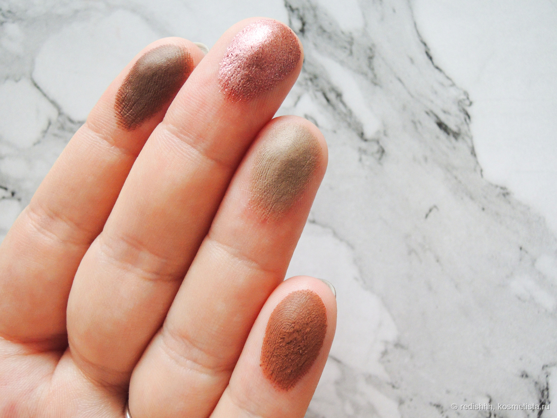 Ну и сами оттенки поближе. Тут на фото ниже камера почему-то съела цвет. В жизни они поярче, как на верхних фото. Зато хорошо видна текстура теней. В палетке 4 оттенка: 3 матовых и один сияющий спаркл.
