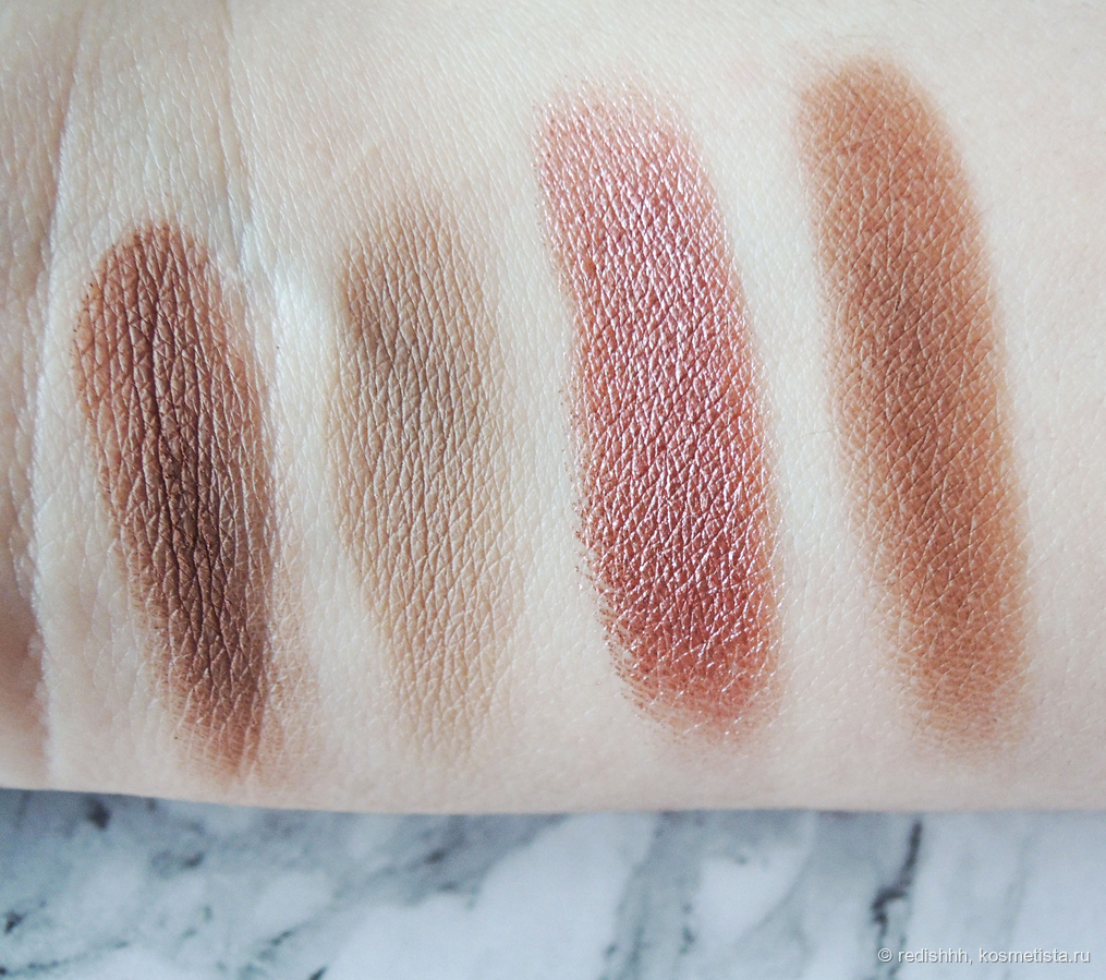 Тени буквально втушевываются в кожу. С ними справится даже новичок в искусстве макияжа. Они тушуют сами себя. Нигде не залипают. Носятся на базе 12+ часов, без базы тоже стойкость хорошая, не менее 6 часов. Гамма хоть и кажется излишне теплой, на самом деле довольно нейтральная. 3 матовых оттенка отлично подходят для максимально дневного макияжа. Собственно, давайте уже их смотреть.