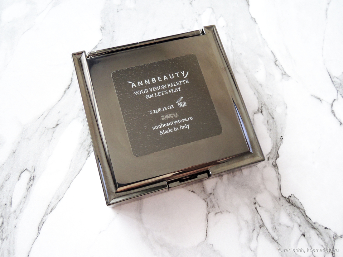 Внешнее оформление палетки Your Vision очень достойное. Картон графитового цвета с логотипом бренда, с обратной стороны коробочки вся необходимая информация о тенях: объем — 5,2 грамма. Сделано в Италии. Не знаю почему, но вместо пыльника внутри меня ждал вот такой защитный картонный кофр. Возможно бренд идет в сторону удешевления внешних атрибутов. Для меня это непринципиально, но предупредить я вас должна.