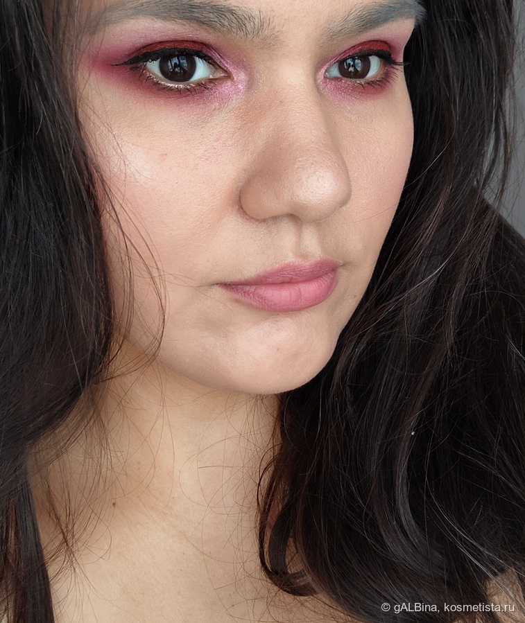 В этот раз я уже учла, что у меня не получится красный макияж, если добавлю чёрный, поэтому использовала в тушевке: crimson sky и bloody rose, на глазах пигмент Tammy Tanuka «Шатенка»: