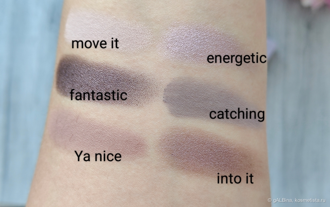 Опять же палетка холодных оттенков. Она не сильно тёмная, но и не прям светлая. Три матовых и три сатина. Сатины уже устаревшие, мне они не особо интересны в использовании: рыхловатые, немного сложно набрать, надо много наслоить для лучшего эффекта.