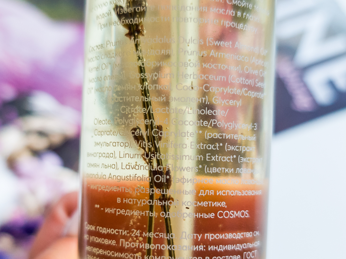 Как для обладателя проблемной комбинированной кожи, мне важно, чтобы масла, входящие в состав были легкими и не забивали поры. Здесь я вижу я масло абрикосовой косточки, оливковое, хлопковое и сладкого миндаля. Также есть экстракты винограда, льна и чабера и эфирное масло лаванды.