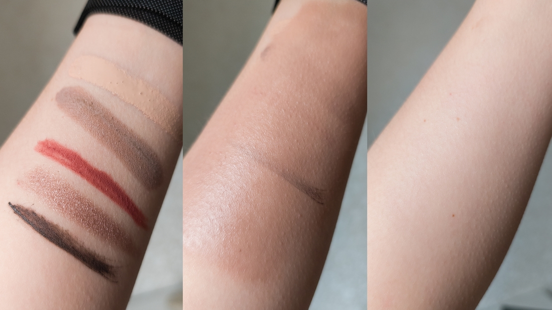 При прямом попадании масла в глаза может возникать лёгкое жжение. Я полагаю, что это вина того самого эфирного масла. Но если смывать макияж аккуратно и с закрытыми глазами, такого не произойдёт. Во всём остальном оно очень комфортно, легко и быстро смывается, не оставляет липкой или жирной плёнки, не вызывает ощущения, будто вы умываетесь жиром или подсолнечным маслом из бутылки. И главное — очень эффективно удаляет макияж, даже стойкий. В комментариях часто просят продемонстрировать работу очищающих средств на руке, поэтому вот ниже результат его работы на консилере, жидком скульпторе, карандаше для губ, кремовых тенях и каком-то стойком тинте для бровей.