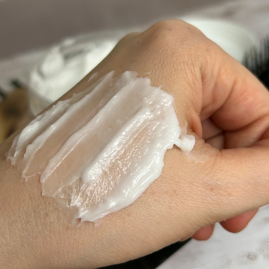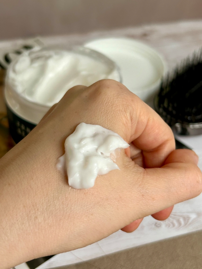 Текстура маски кремовая, плотная, как взбитое суфле. По волосам распределяется легко, не течёт.