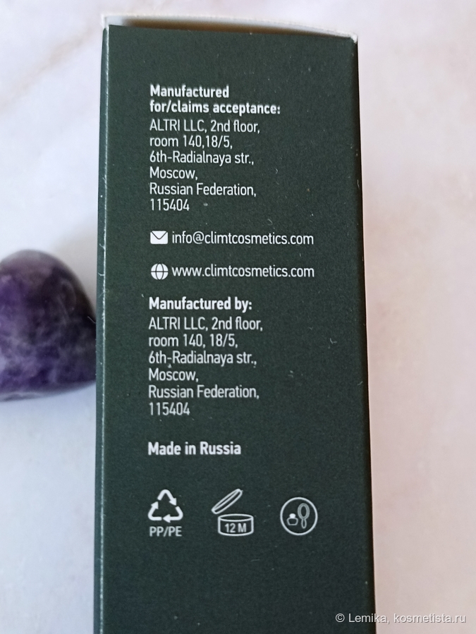 Здесь мы видим, что марка называется Climtcosmetics (одним словом, а не Climt Cosmetics, как можно подумать, взглянув на другие грани упаковки).