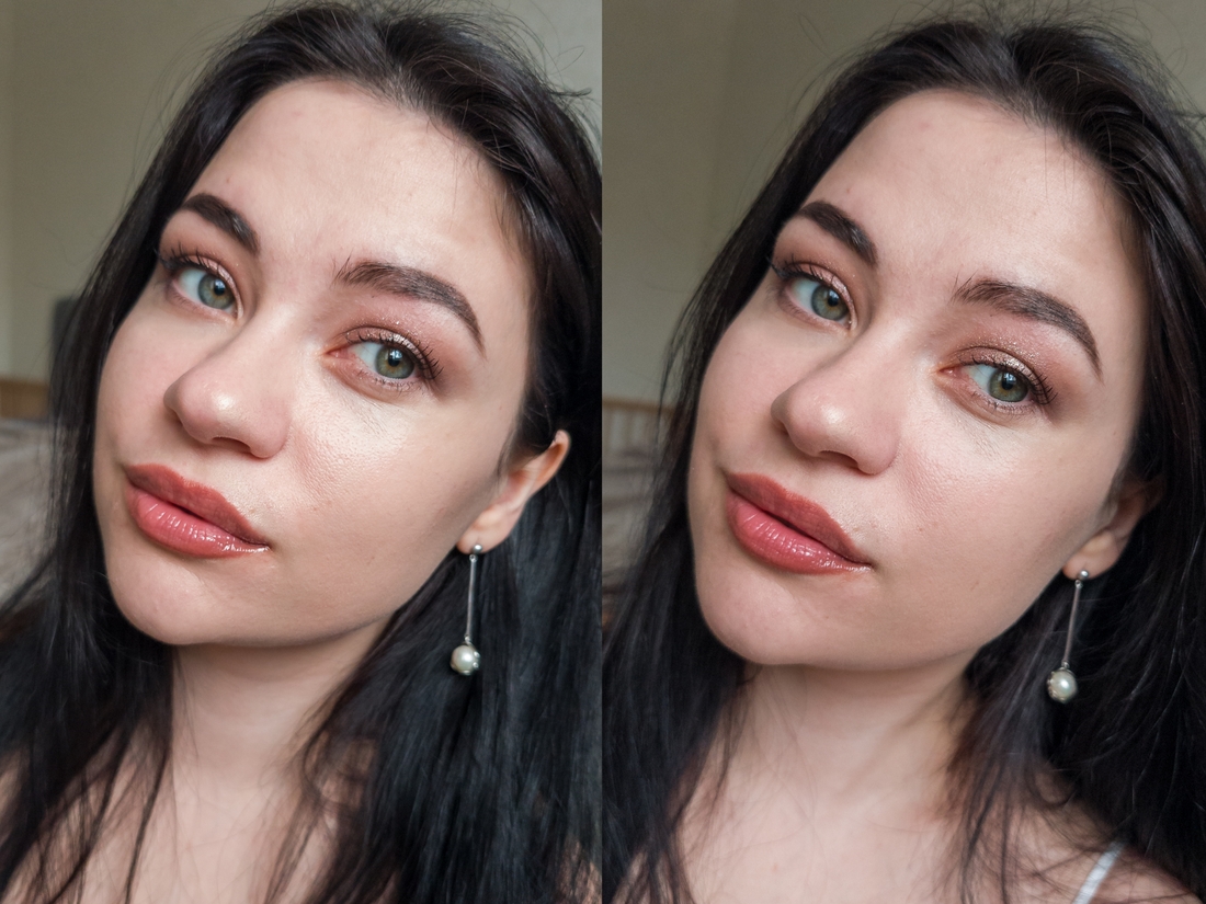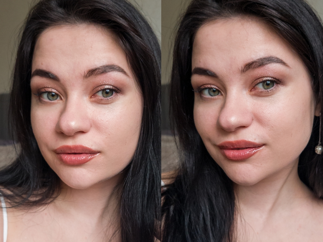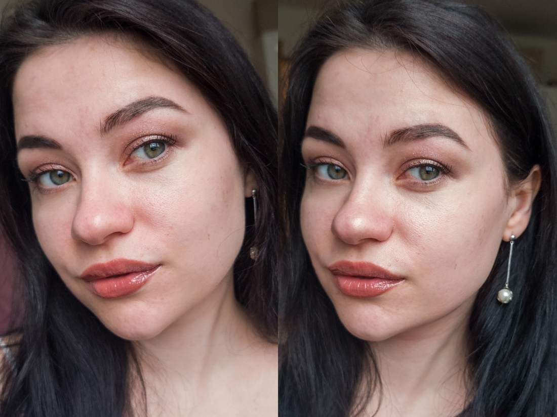 Слева кожа до нанесения базы, справа после. Она действительно неплохо увлажняет кожу, то есть в принципе, уход с ней не нужен. Сияние получается очень деликатное, влажно-жирного эффекта, каждый у Soft glam filter от Catrice тут и близко нет. Отдельных сияющих частичек тоже не вижу. Финиш немного липкий, но в контексте базы это допустимо, на эту липкость, как на скотч, потом будут приклеиваться все последующие слои макияжа. Рельеф не сглаживает, поры тоже не скрывает, а даже как будто подчёркивает все это дело за счет сияющей текстуры.