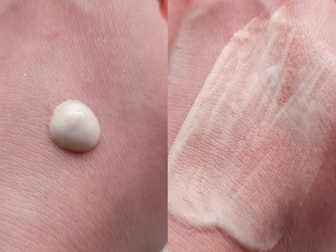 Текстура легчайшего серума с мелким жемчужным шиммером. Кроющего пигмента в базе нет, поэтому сразу не надеемся на то, что она будет что-то скрывать. Не жирная, не плотная, при распределении ощущается приятный холодок. Но, считаю своим долгом предупредить, что база конфликтует с уходом, несколько раз я наносила ее поверх сывороток, крема или их комбинации и она потом скатывается. Если наносить ее на чистое лицо, скатываний нет.