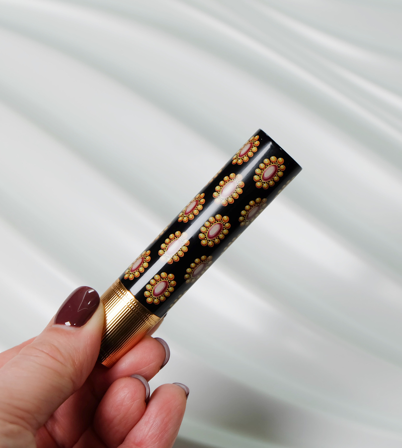 У помад бренда довольно специфичное оформление, их легко узнать по яркому принту, украшающему футляр. Эта помада не исключение!