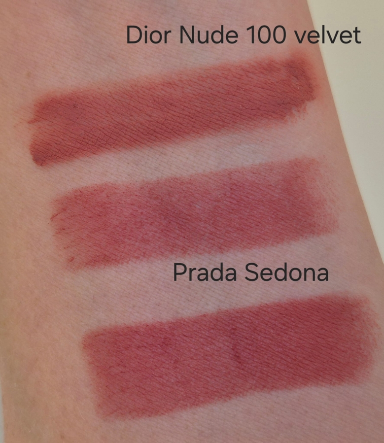 Разница в финише — Диор ложится чуть плотнее и выглядит более матово. Для меня Прада в этом оказалась более приятной. Кроме этого у неё нет выраженного аромата и привкуса, как у помады Диор.