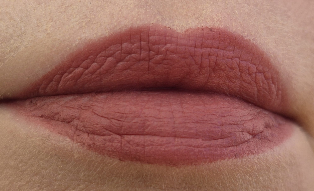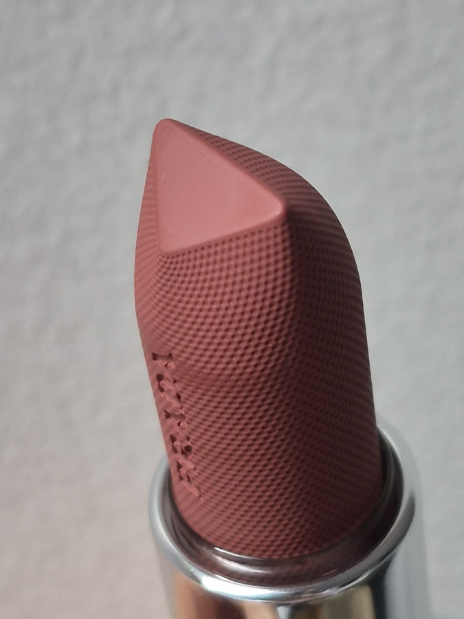 Несмотря на упомянутый матовый эффект в названии, полноценно матовой помада не является. Это больше пудровая и вельветовая помада, которая сразу после нанесения имеет сатиновый отблеск.