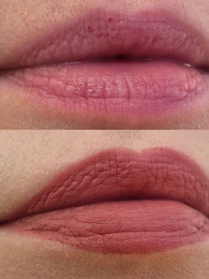 У меня светлые с розовинкой губы, но достаточно бледные. При нанесении даже в один слой цвет перекрывается помадой полностью. Но на что хочу обратить внимание — как ровно лежит помада по контуру губ без карандаша, как четко прокрашивается контур без затёков в морщины и тот самый блюрящий эффект, особенно выраженный на нижней губе.