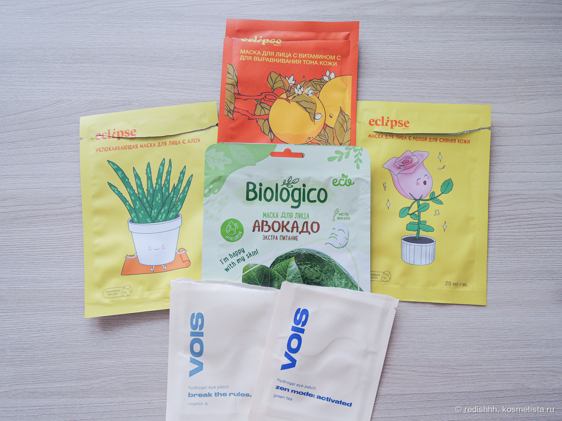 Использовала несколько видов масок от отечестенного бренда Eclipse: с розой (для сияния кожи), с алоэ (успокаивающая) и с витамином С (для выравнивания тона кожи). Маски классные и снаружи они выглядят ярко, и внутри достаточно пропитки, хорошие лекала. В общем, отличные маски, если вы любите такие sos-средства.
