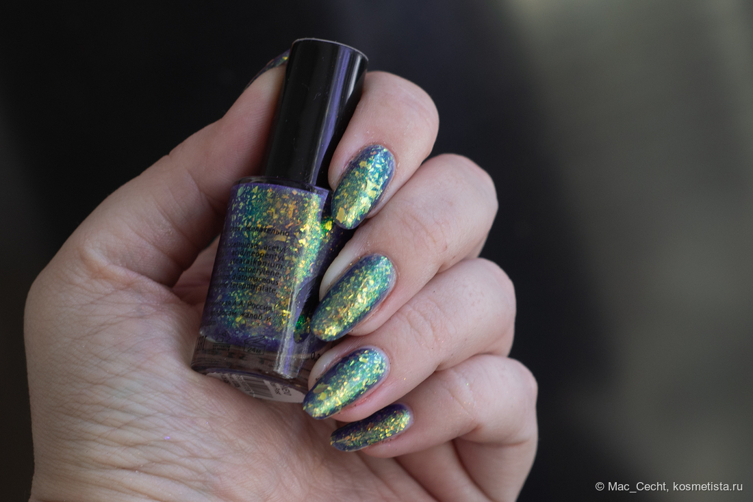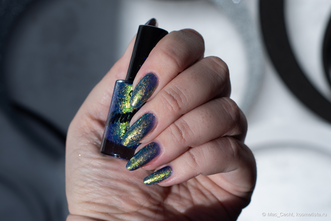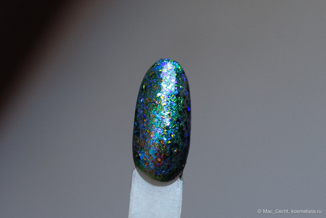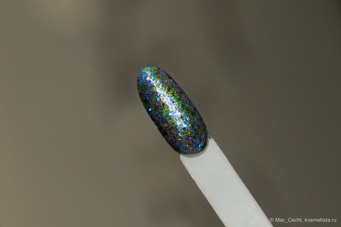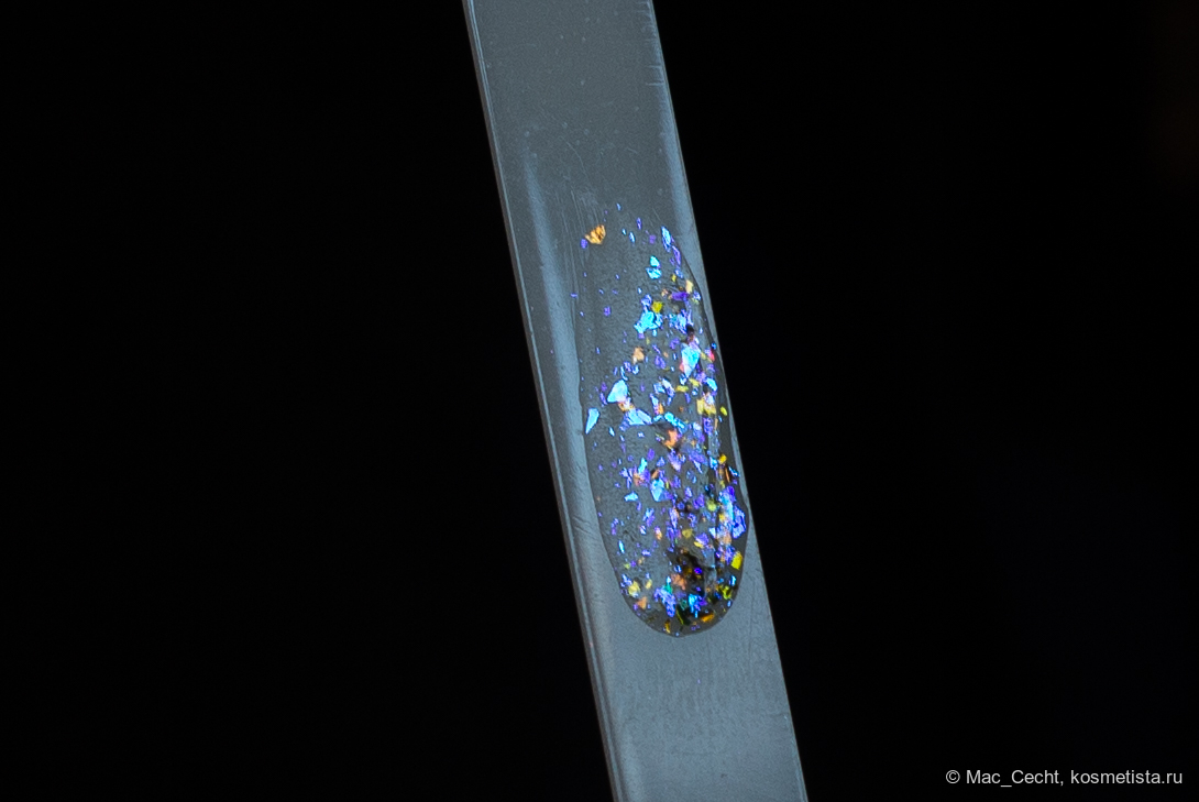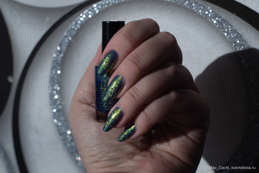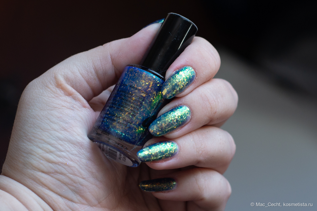 Марка описывает топ как «прозрачный с синей слюдой и мультихромной (медно-золото-зелёной) поталью». Топ действительно прозрачный, и в один слой добавит только немного разноцветных искр.