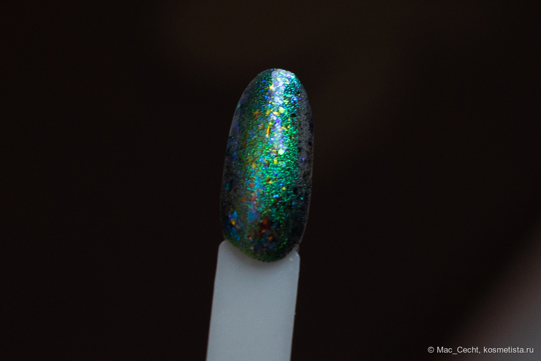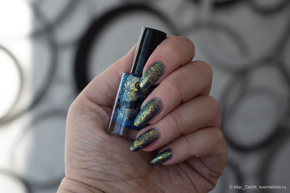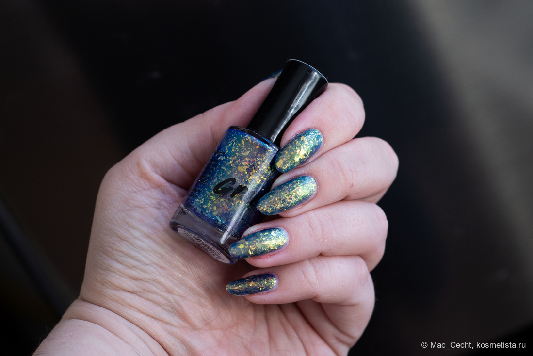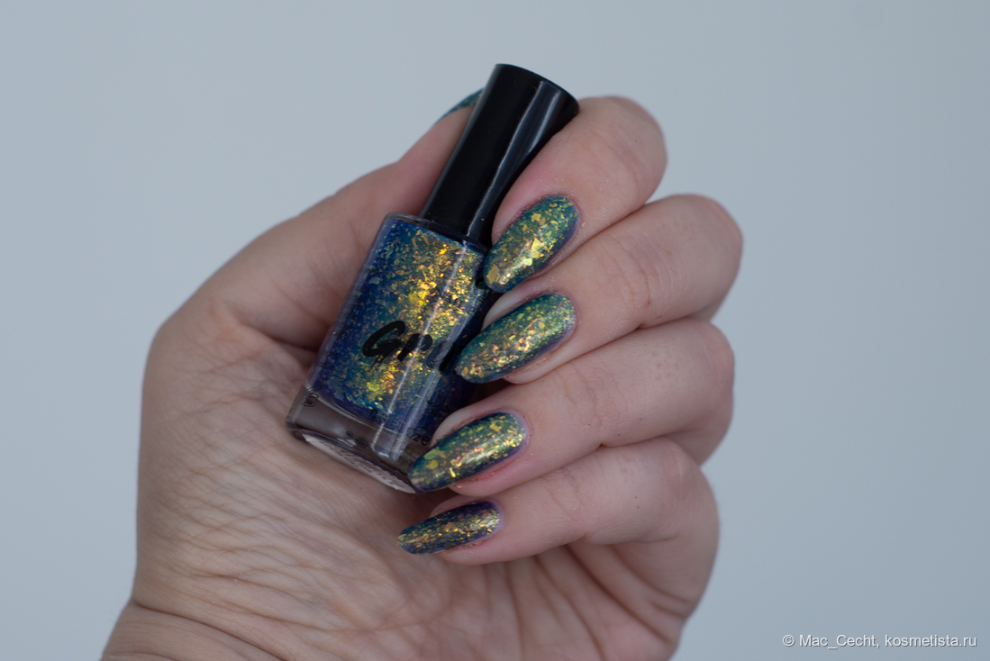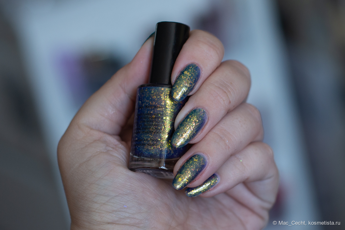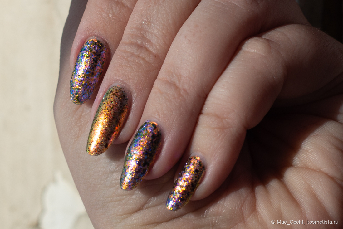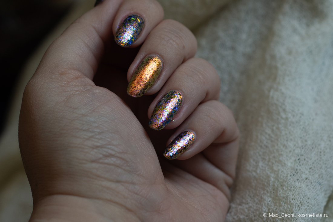 Марка описывает топ как «прозрачный с синей слюдой и мультихромной (медно-золото-зелёной) поталью». Топ действительно прозрачный, и в один слой добавит только немного разноцветных искр.
