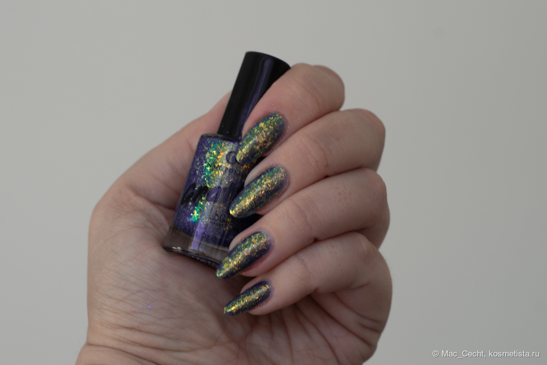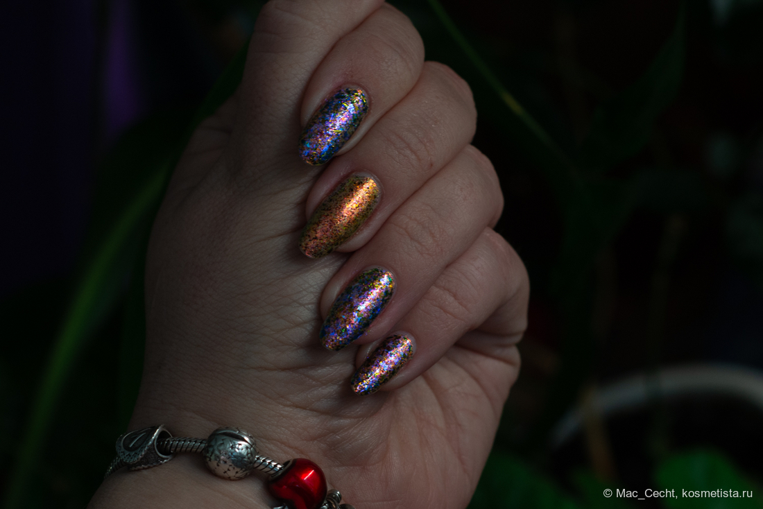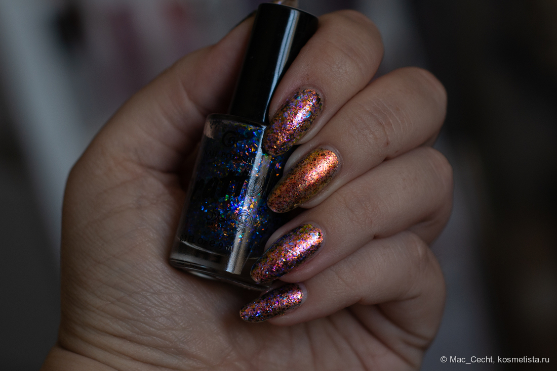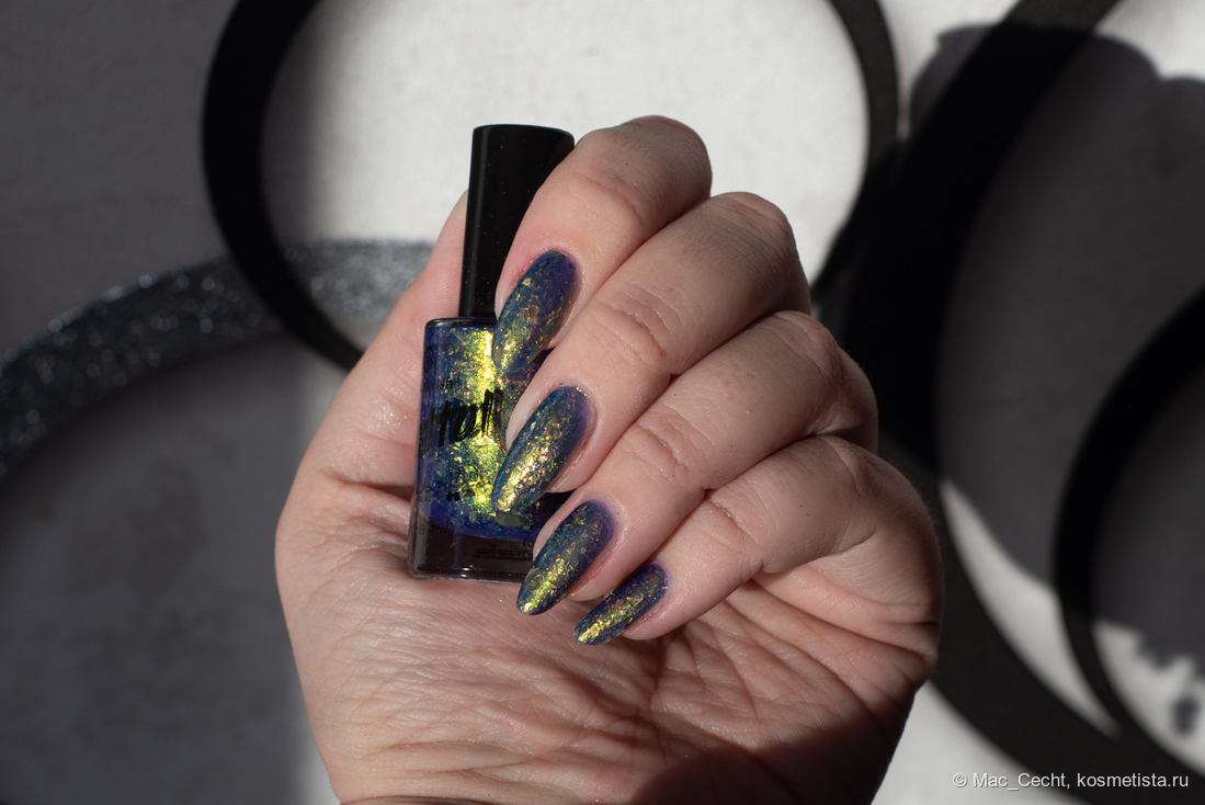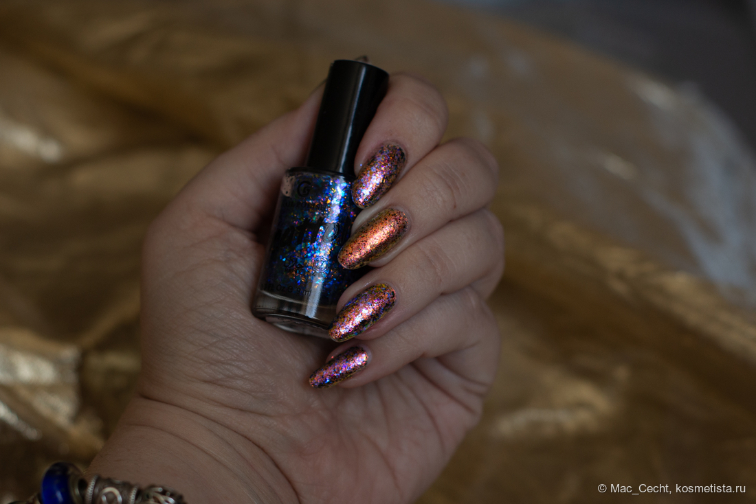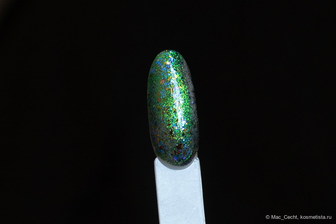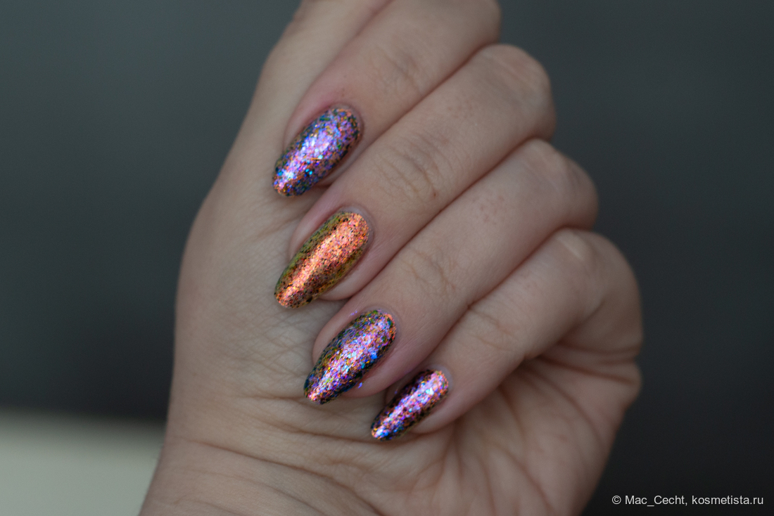 Марка описывает топ как «прозрачный с синей слюдой и мультихромной (медно-золото-зелёной) поталью». Топ действительно прозрачный, и в один слой добавит только немного разноцветных искр.